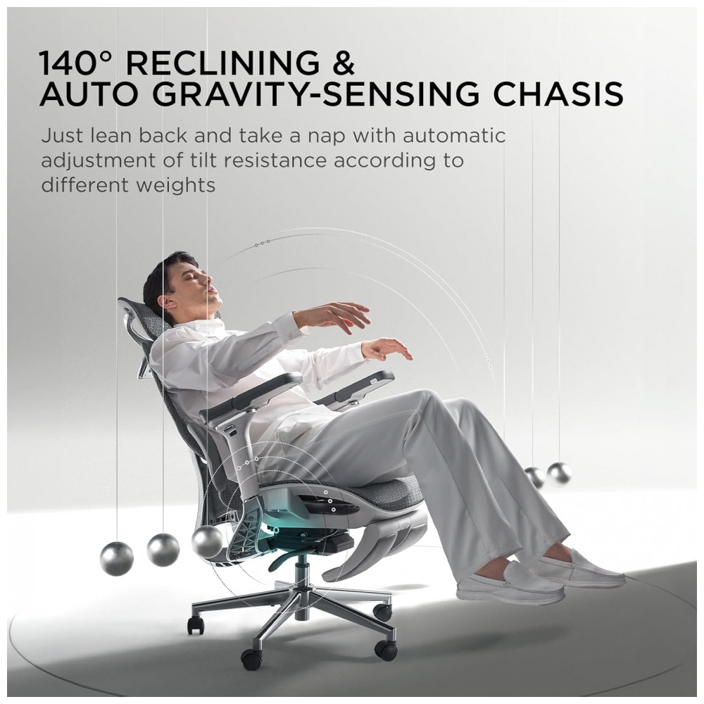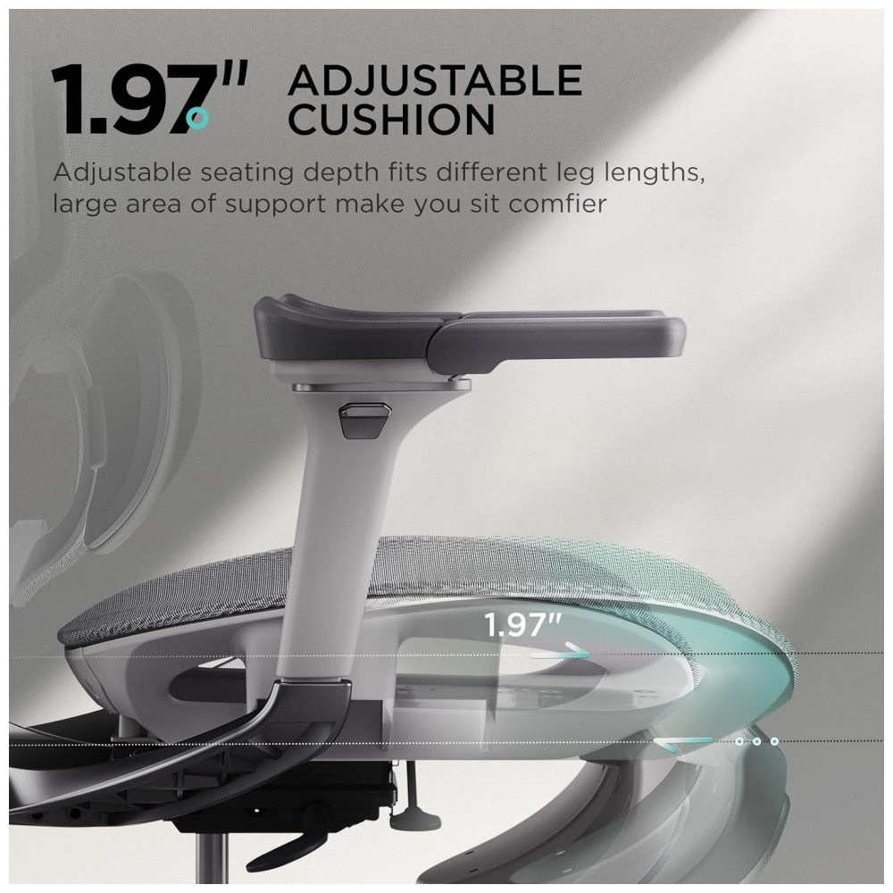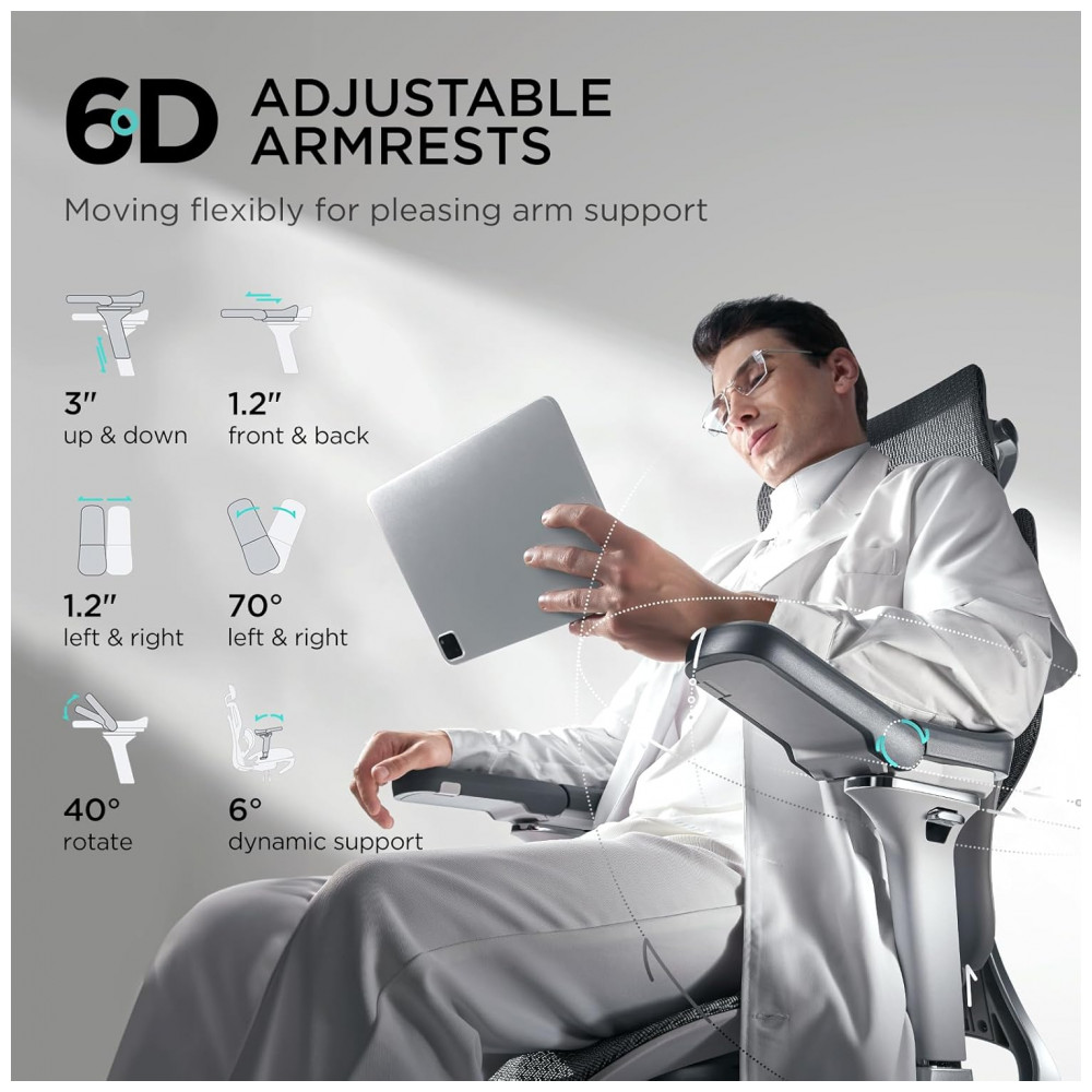 Os apoios de braço 6D mecânicos oferecem ajustes em altura de 7,5 cm, deslize front/back de 3 cm, deslocamento lateral de 3 cm, rotação em 70° com 3 estágios, rebatimento de 40° em 2 estágios e inclinação sincronizada de 6°, com pivô giratório 360° para uso em superfícies variadas. O assento possui regulagem de profundidade de 5 cm (1,97 polegadas convertidas) e chassi com detecção gravitacional automática, respondendo a variações de peso e postura para transições suaves.