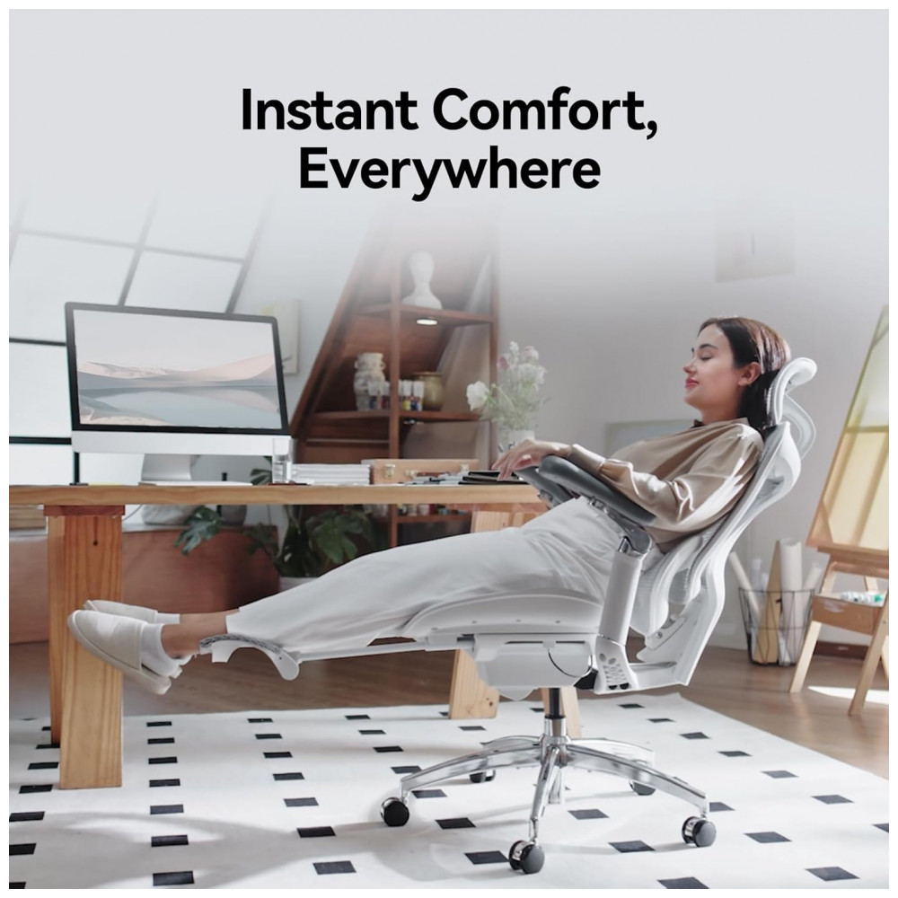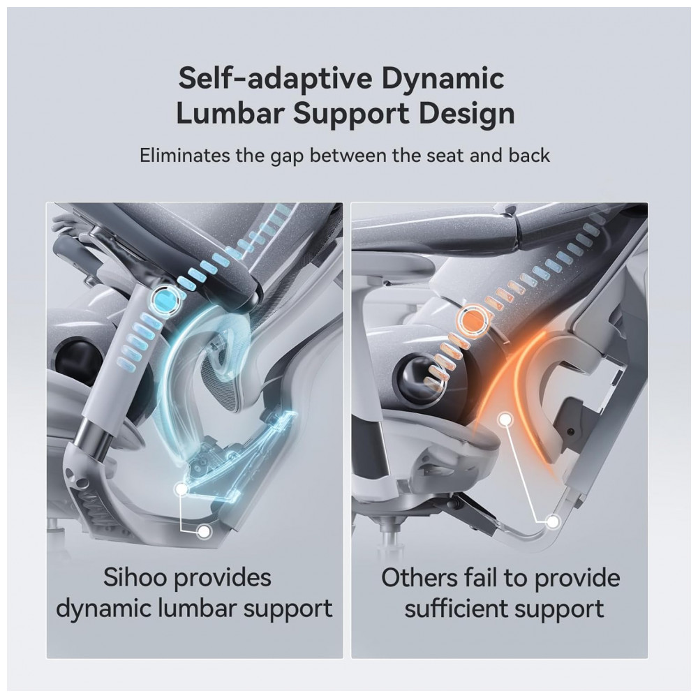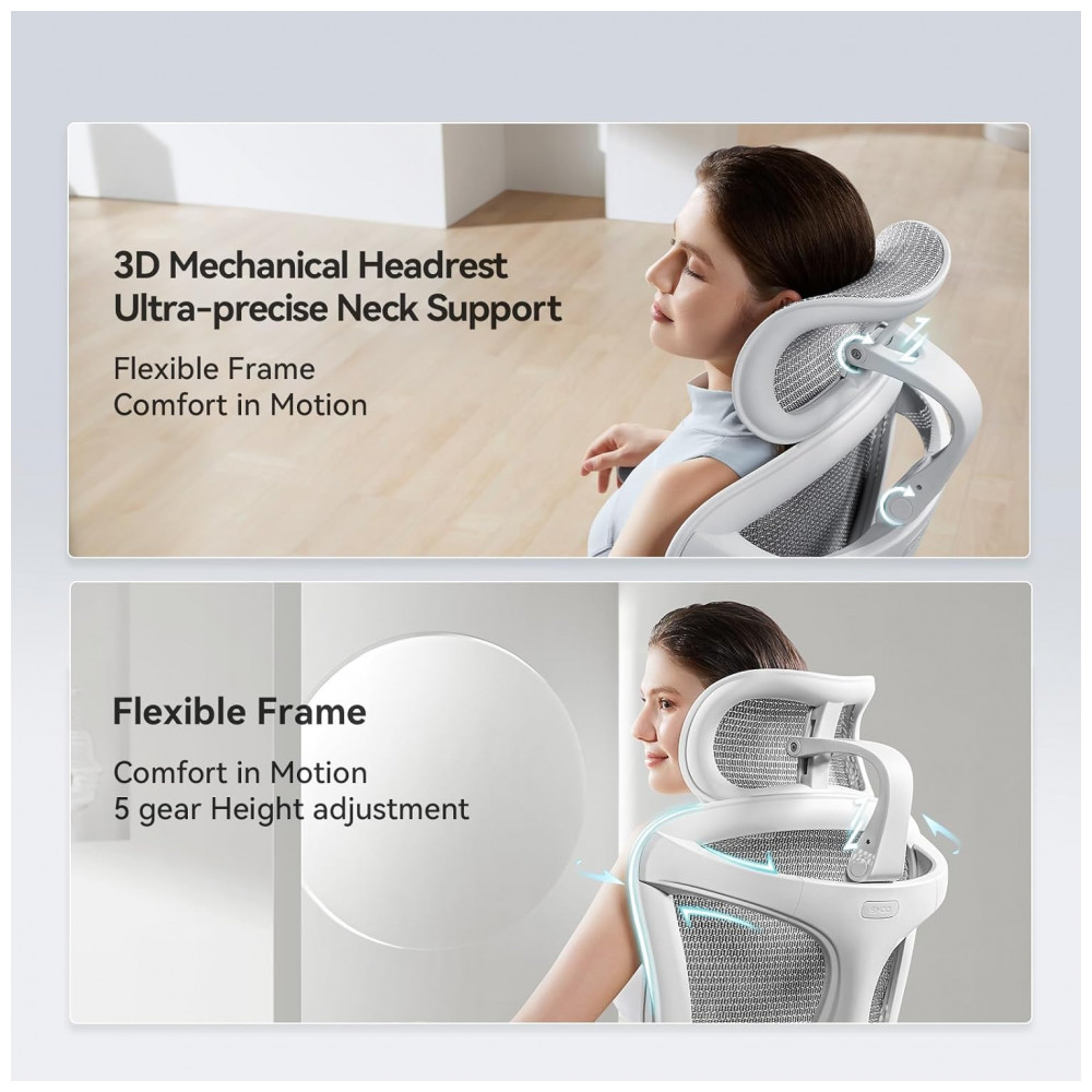 A cadeira ergonômica de escritório SIHOO Doro C300 Pro com apoia-pés integra encosto em malha respirável com estrutura flexível triangular que acompanha movimentos laterais do tronco, regulável em 4 posições com elevação de 6 cm e retorno automático ao nível base. O encosto de cabeça 3D permite ajustes precisos de 4,5 cm vertical, 6,5 cm anteroposterior e inclinação de 20°, sincronizado com o mecanismo principal para alinhamento dinâmico durante operação.