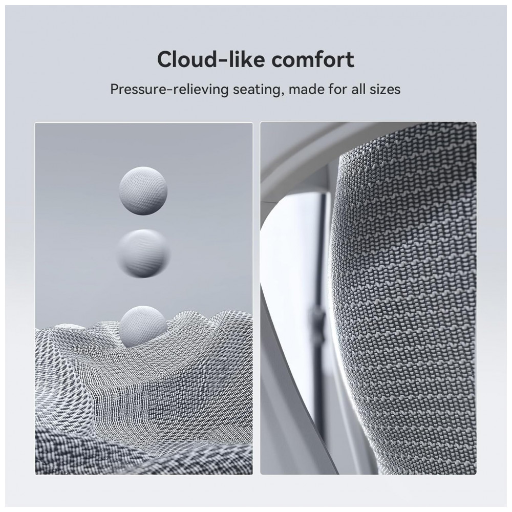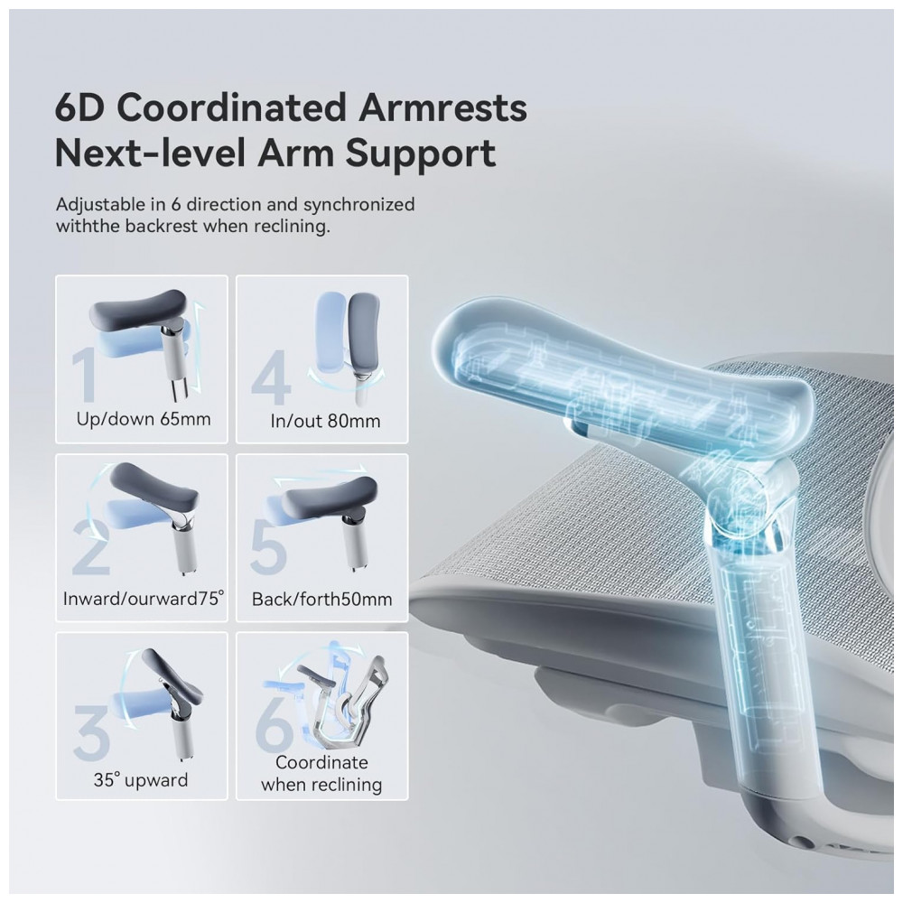 Os apoios de braço 6D ultra macios oferecem regulagens em cinco eixos coordenados com reclinação do encosto, incluindo altura, deslize front/back, rotação, inclinação lateral e ajuste angular, com superfície pillow-top para suporte contínuo em posturas variadas de trabalho ou gaming. O assento ampliado em malha com enchimento de espuma incorpora regulagem de profundidade e dispositivo inteligente de detecção de peso que adapta automaticamente a tensão de reclinação em posições pré-definidas de até 135°.