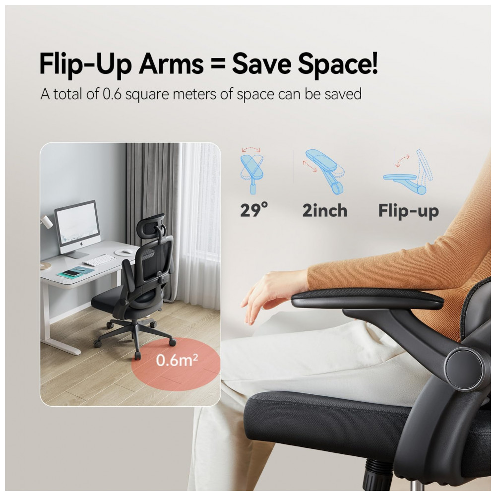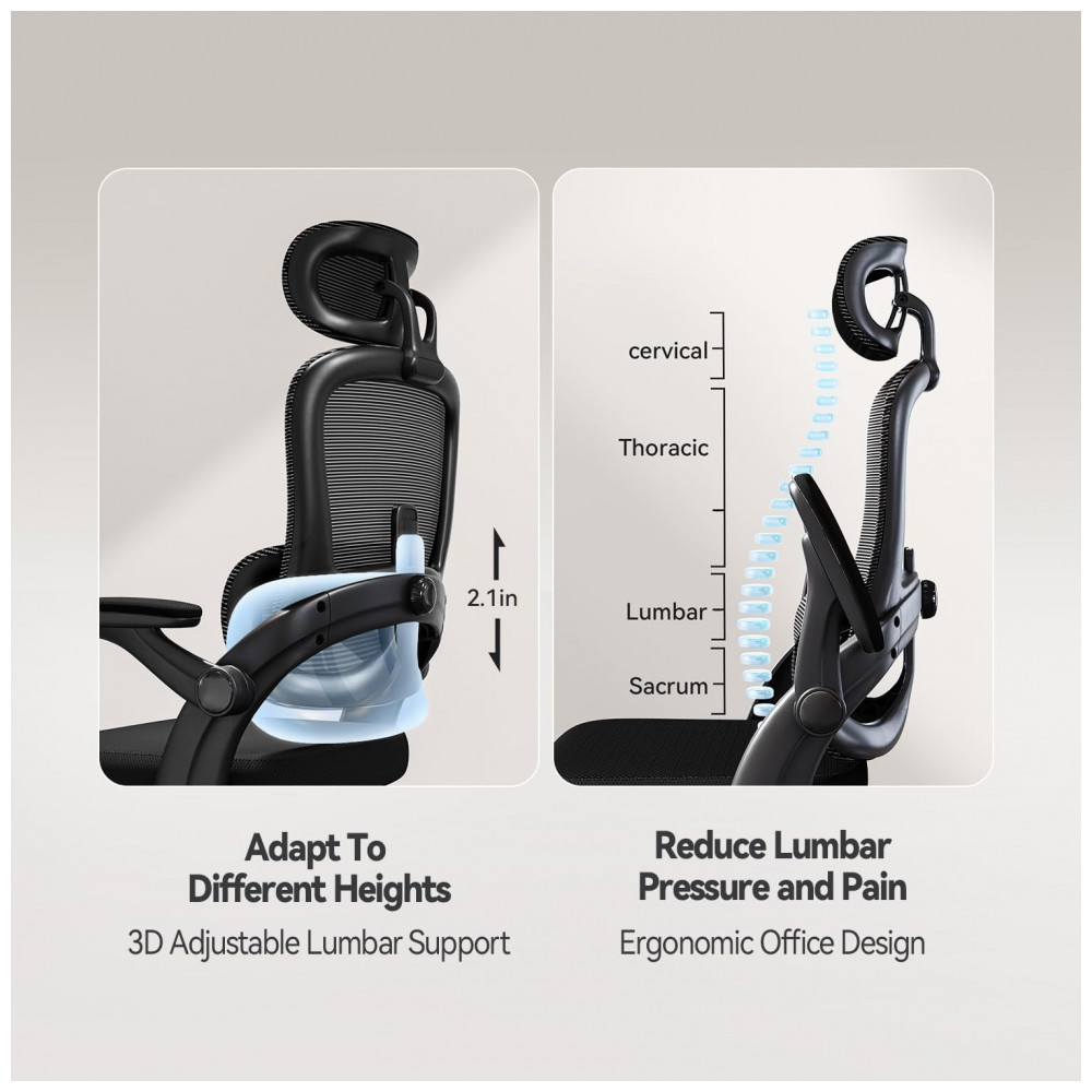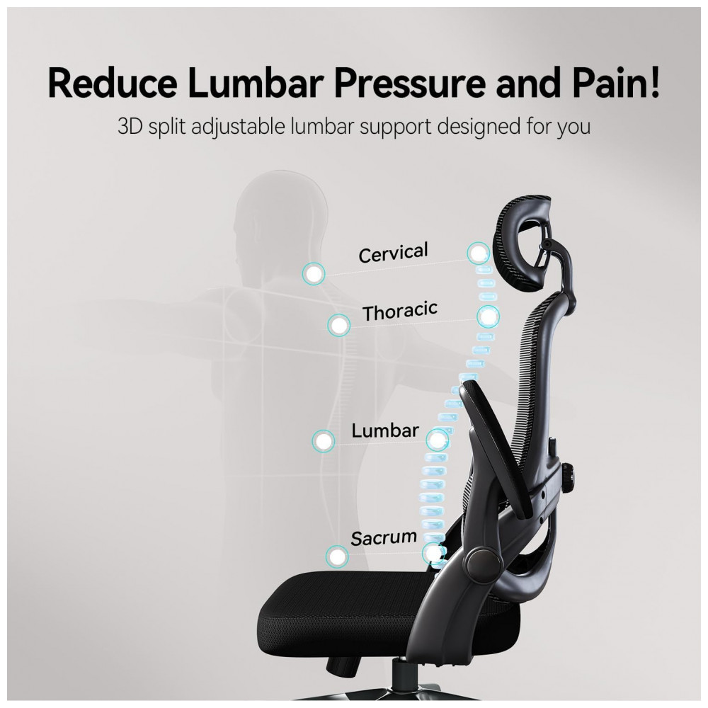 A cadeira ergonômica de escritório SIHOO M102C possui apoio lombar independente com regulagem vertical de até 6 cm, permitindo ajustes personalizados para diferentes posições de sentado, incluindo inclinação para frente ou reclinação. O encosto em malha elástica de alta qualidade promove ventilação e é fácil de limpar, com estrutura que se adapta ao movimento do tronco superior.