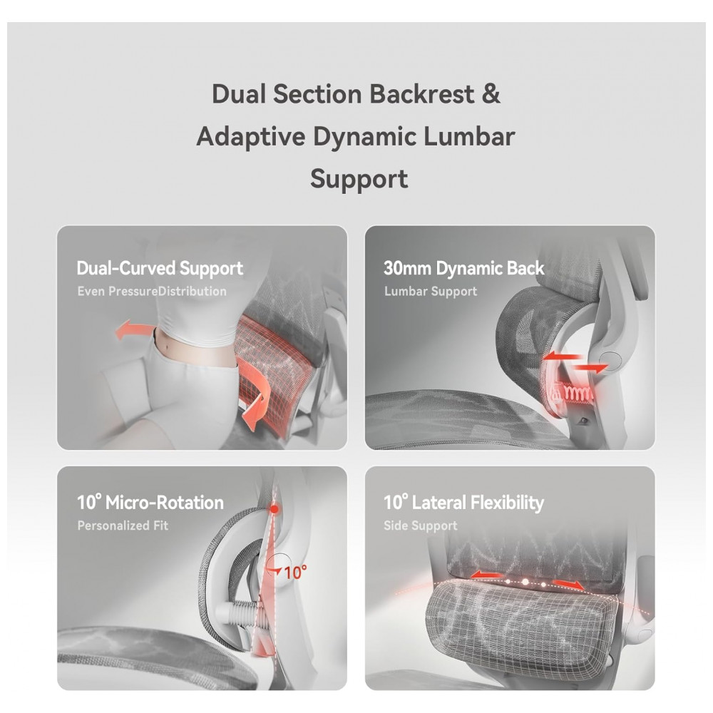 A cadeira ergonômica de escritório SIHOO M57 utiliza apoio lombar dinâmico com ajuste automático independente, adaptando-se a movimentos do tronco através de mecanismo elástico com múltiplas molas para suporte contínuo na região lombar durante posturas variadas. O encosto em malha de alta elasticidade promove ventilação natural, com estrutura flexível que acompanha a curvatura das costas e regulagem de altura em faixas amplas para diferentes estaturas.