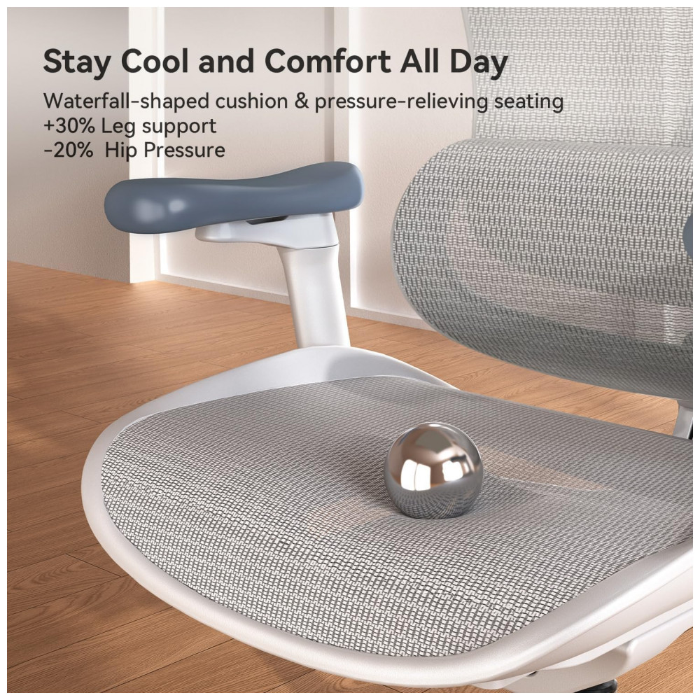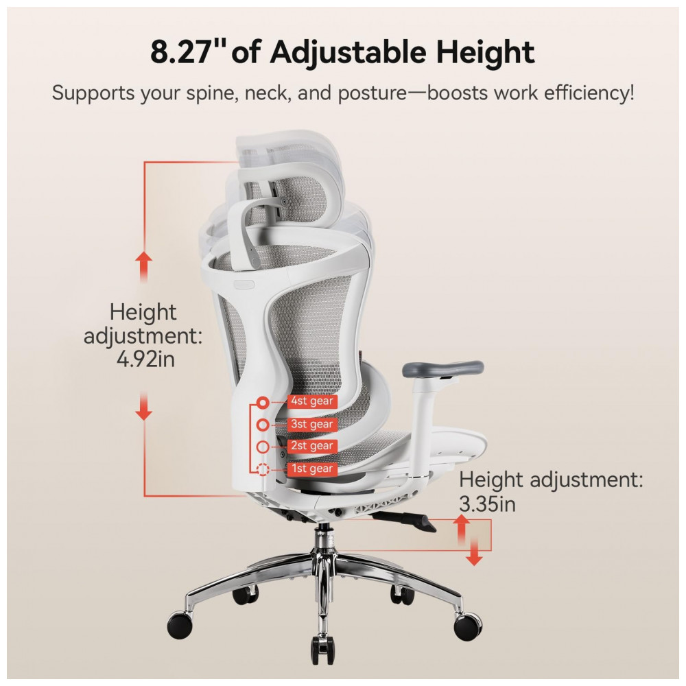 A cadeira ergonômica SIHOO Doro C300 integra um encosto dinâmico com estrutura flexível que se adapta aos movimentos do tronco superior, garantindo alinhamento lombar contínuo com ajustes verticais e laterais testados para mais de 120.000 ciclos de movimento. O encosto ajustável em 4 posições eleva-se em 6 cm, compatível com diversas estaturas, enquanto o apoia-cabeças 3D macroajustável permite deslocamentos de 4,5 cm vertical, 6,5 cm anteroposterior e 20° de ângulo, construído em malha macia com estrutura elástica triangular para suporte dos ombros à região lombar. Os apoios de braço 3D sincronizados oferecem ajustes em altura, profundidade, largura e rotação, movendo-se em conjunto com o reclínio do encosto, complementados por mecanismo de gravidade inteligente com resiliência ajustável ao peso, permitindo inclinações de 92° a 112° em 2 etapas automáticas para movimento de balanço controlado. Fabricada com malha respirável no encosto e assento, estrutura em alumínio polido, elevador pneumático classe 4 e base de 350 mm, atende certificações de segurança e durabilidade.