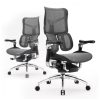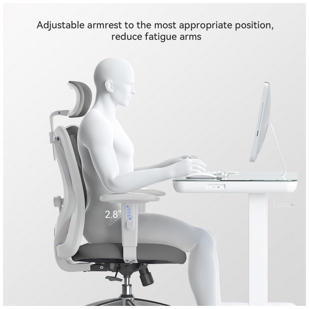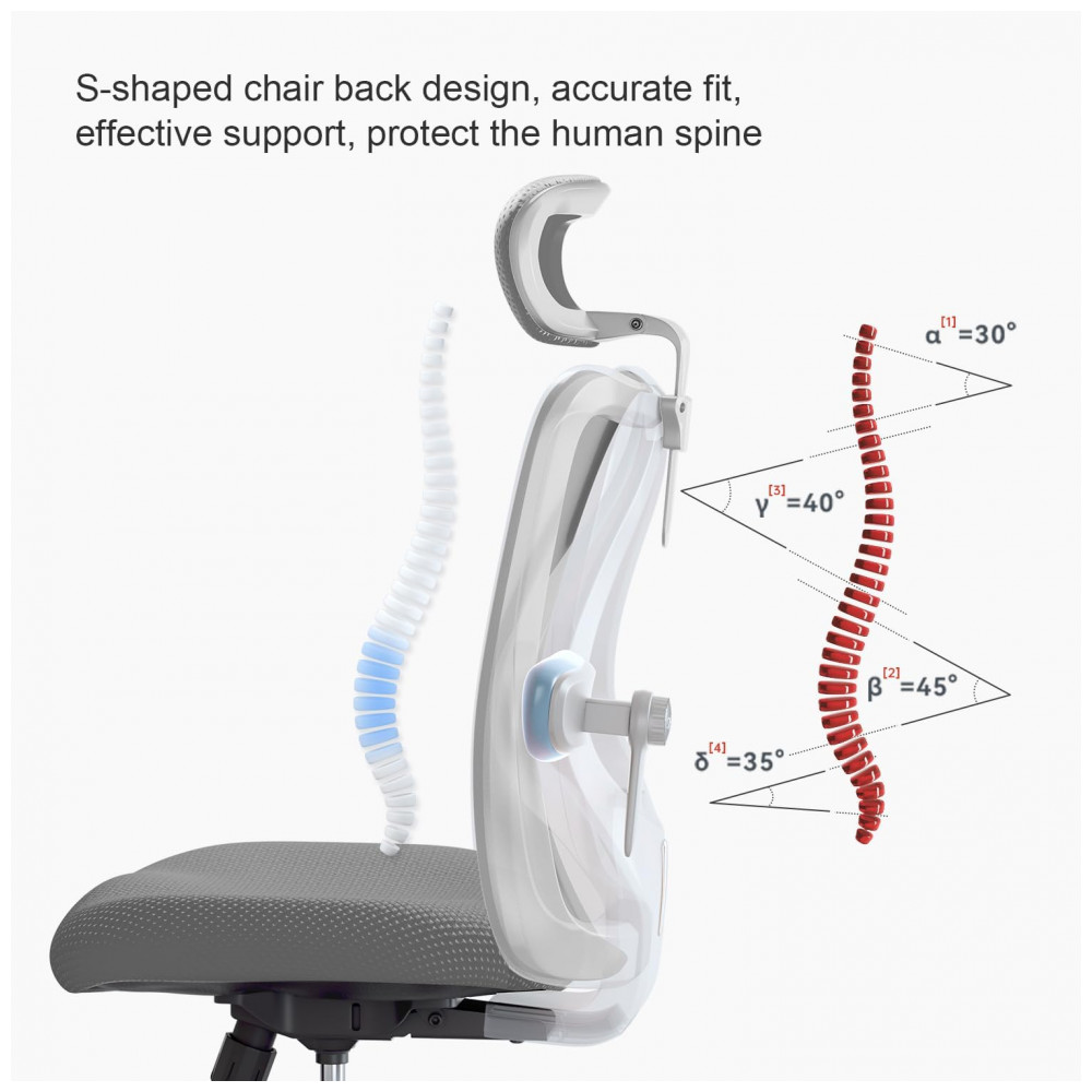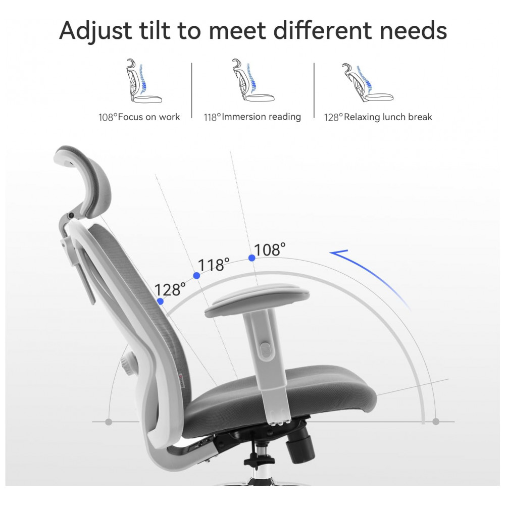 A cadeira ergonômica SIHOO M18 possui estrutura com quatro zonas de suporte integradas, incluindo apoia-cabeças ajustável em altura, suporte lombar regulável, assento com tensão de inclinação configurável e elevação pneumática do assento. O encosto utiliza malha flexível respirável para ventilação contínua, combinada com assento em poliuretano e enchimento em espuma de memória para distribuição uniforme de pressão. O mecanismo de inclinação permite duas posições de reclínio com trava, suportado por base metálica com rodas em poliuretano adequadas para pisos carpetados ou rígidos, e rotação de 360 graus. Certificada BIFMA, a cadeira inclui montagem simplificada em oito etapas, com componentes como almofada integrada e braços fixos para estabilidade durante uso prolongado em ambientes de escritório.