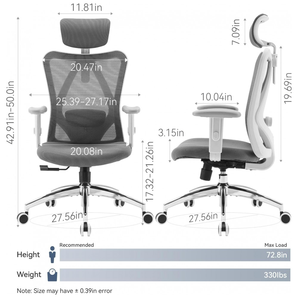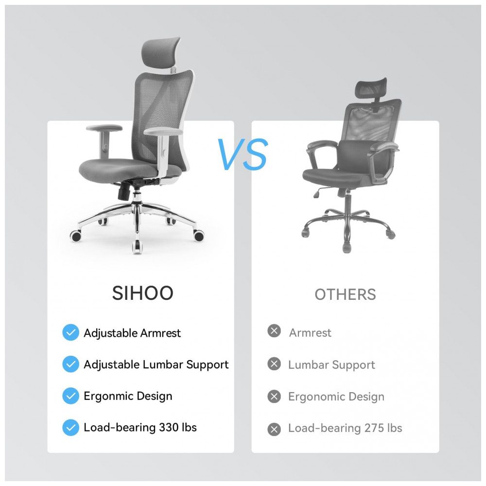 Cadeira Ergonômica SIHOO M18 com Apoia-Cabeças e Suporte Lombar Ajustáveis Alta Costas Executiva Giratória para Escritório em Casa (Cinza Escuro)