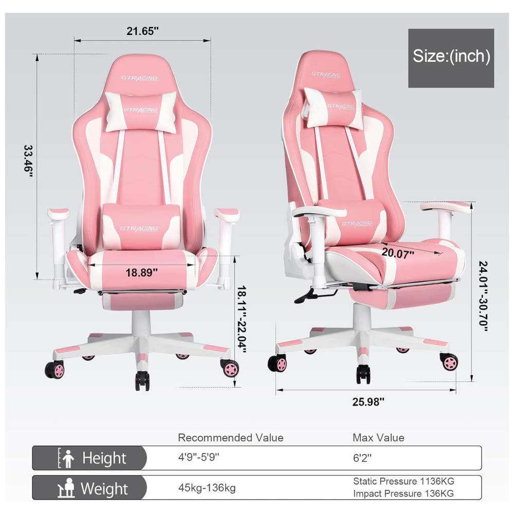 Cadeira Gamer Ergonômica Ajustável com Apoio para os Pés e Branca GTRACING Branco