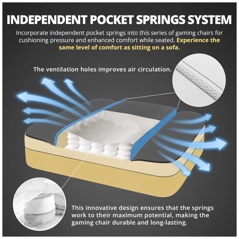 ALMOFADA DE MOLAS BOLSAS ORIGINAIS Incorporamos molas ensacadas independentes comumentes em colchões em nossa cadeira de jogos. As músicas distribuem o peso do corpo uniforme e forneçam o adequado do suporte, aliviando efetivamente uma pressão na região lombar. Além disso, o design apresenta os orifícios de ar que aumentam uma capacidade de carga do sistema de molas e, no mesmo tempo, minimizam ou ruem.