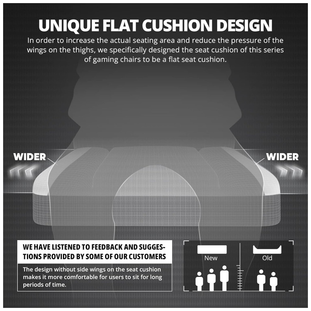 ÁREA DE ASSENTO MAIOR Projeto de almofada de assento plano de referência uma área de assento mais espaçosa, com pelo menos de largura extra em comparação com as almofadas táticas de cadeiras de jogos. Uma remoção das mais tarde, reduzir a pressão nas pernas, permitir uma experiência de sentar mais relaxada e confortável.