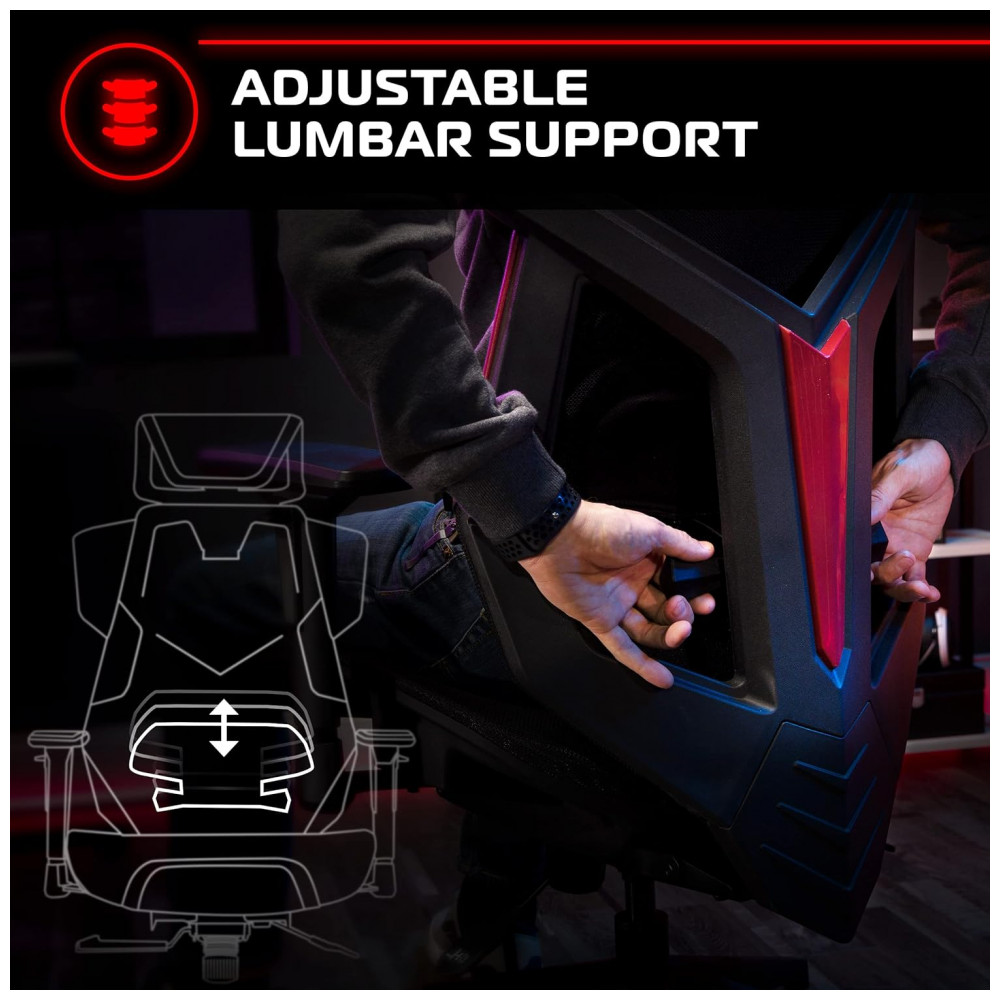 Os braços ajustáveis 2D permitem personalizar a altura e a profundidade frontal, traseira. O suporte lombar acolchoado e ajustável proporciona suporte direcionado à região lombar.