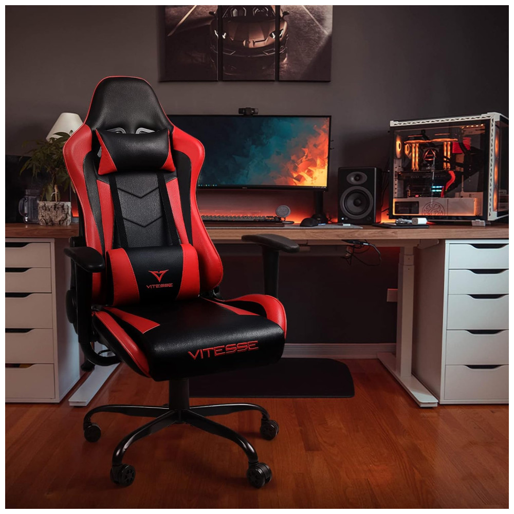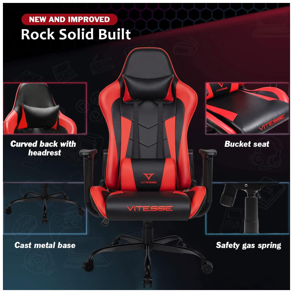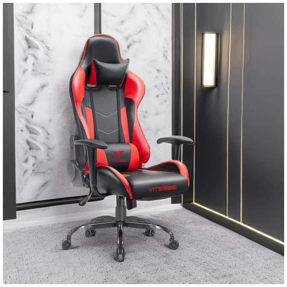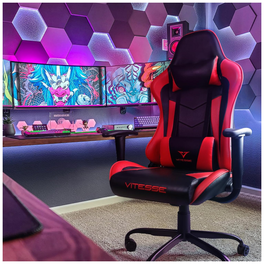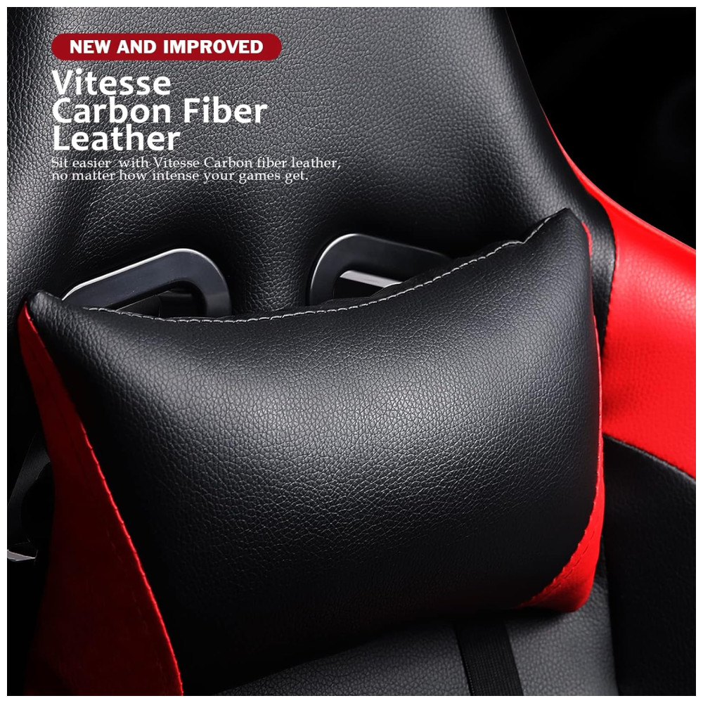 Material selecionado Cadeira de jogos de corrida Vitesse com couro PU premium macio e resistente ao desgaste estilo fibra de carbono, estrutura de aço de alta qualidade.