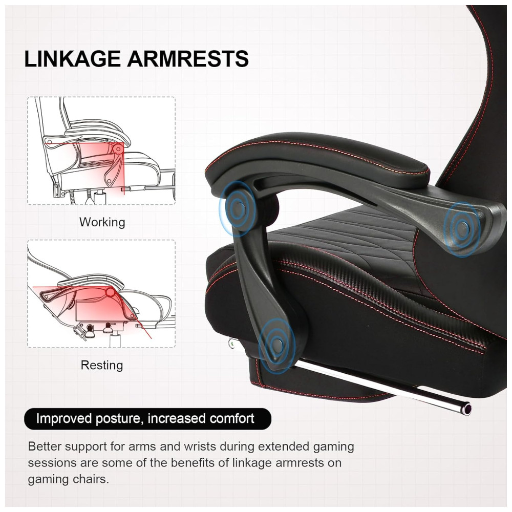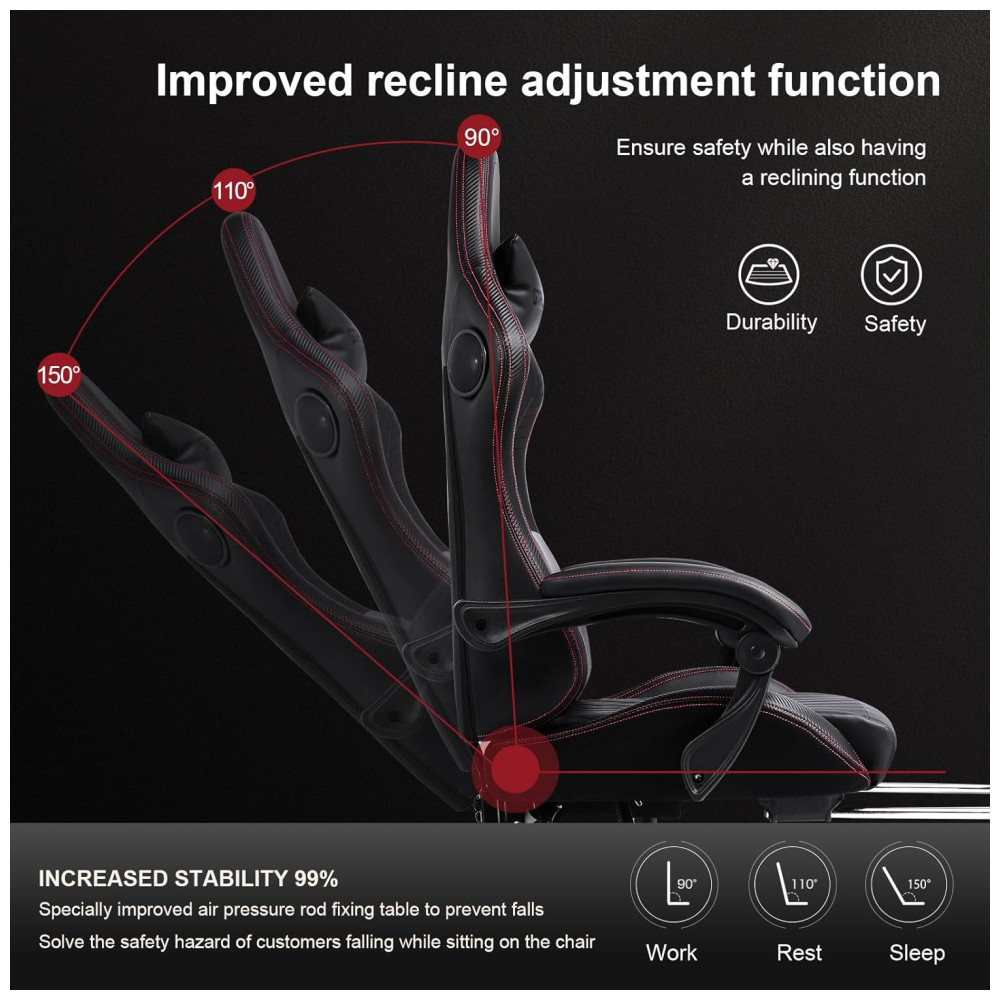 Recursos de design superioresRolos de carro de corrida multidirecionais com rotação de 360 o ângulo máximo de inclinação do encosto da cadeira gamer é de 150, com apoio de pés acolchoado retrátil e apoios de braços articulados. Quando estiver cansado, você pode puxar o apoio para os pés, reclinar a cadeira, conectar se ao bluetooth e deitar se na cadeira para desfrutar da música surround 3D. Esta cadeira para jogos de escritório é o seu assento ideal para trabalho, estudo e entretenimento