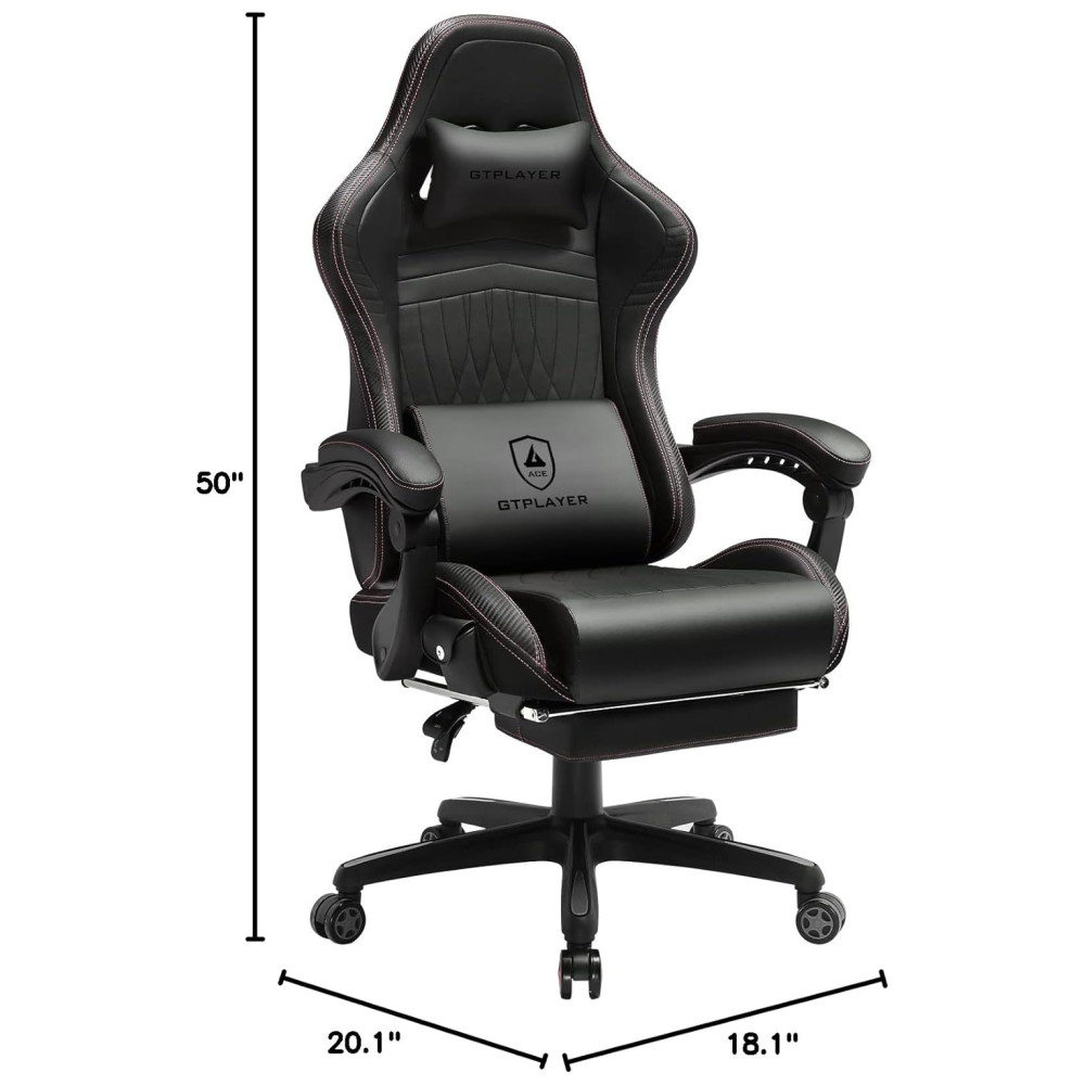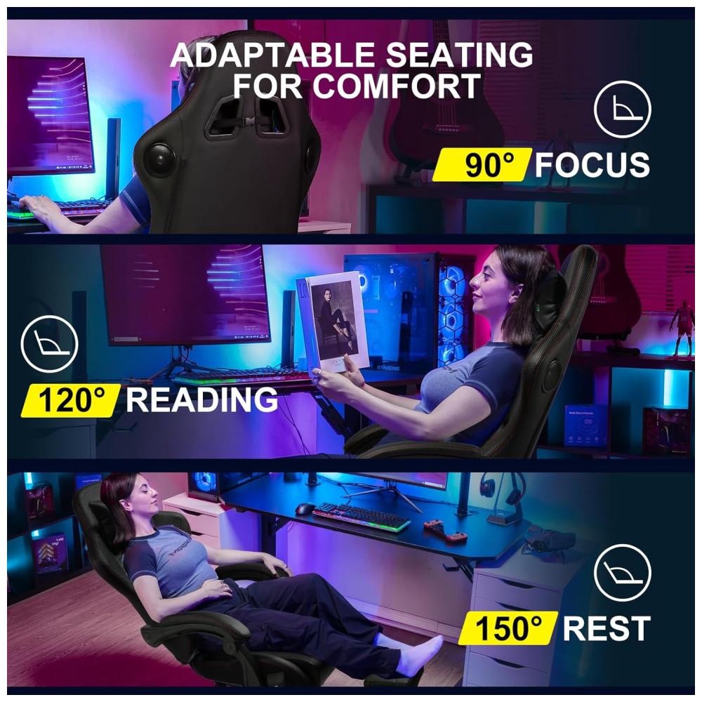 Cadeira ergonômica para jogos A curva ergonômica do encosto se ajusta à anatomia humana e se adapta ao seu corpo para uma experiência de sentar perfeita. Encosto de cabeça flexível e travesseiro lombar de espuma viscoelástica fornecem um suporte macio e confortável. Asas 15 mais largas garantem que não haja limitação no movimento dos ombros. Adequado para jogos, trabalho, estudo e home office.
