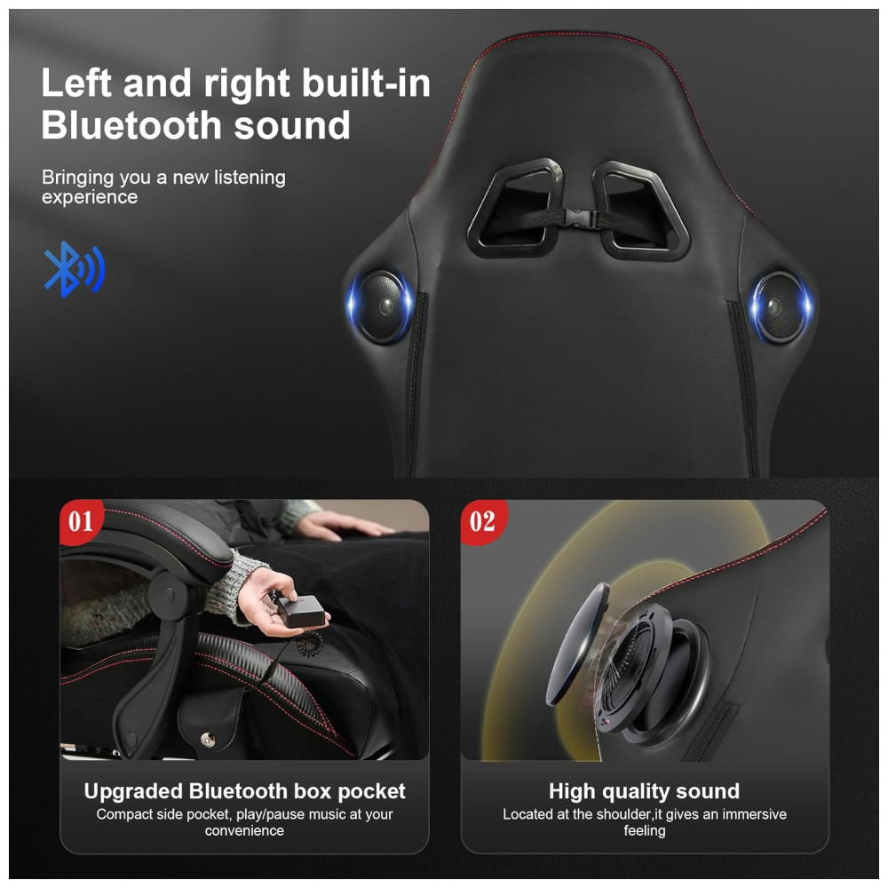 Cadeira para jogos Bluetooth compatível com 5.1 projetada com dois alto falantes Bluetooth 5.1. O sistema de som surround traz o melhor em seu entretenimento, oferecendo som estéreo notável e ricamente detalhado em graves sólidos e agudos nítidos. Conecte o ao seu smartphone, tablet ou outros dispositivos habilitados para Bluetooth e curta músicas, jogos para celular ou filmes com um som emocionante de cinema da sua cadeira de jogos.