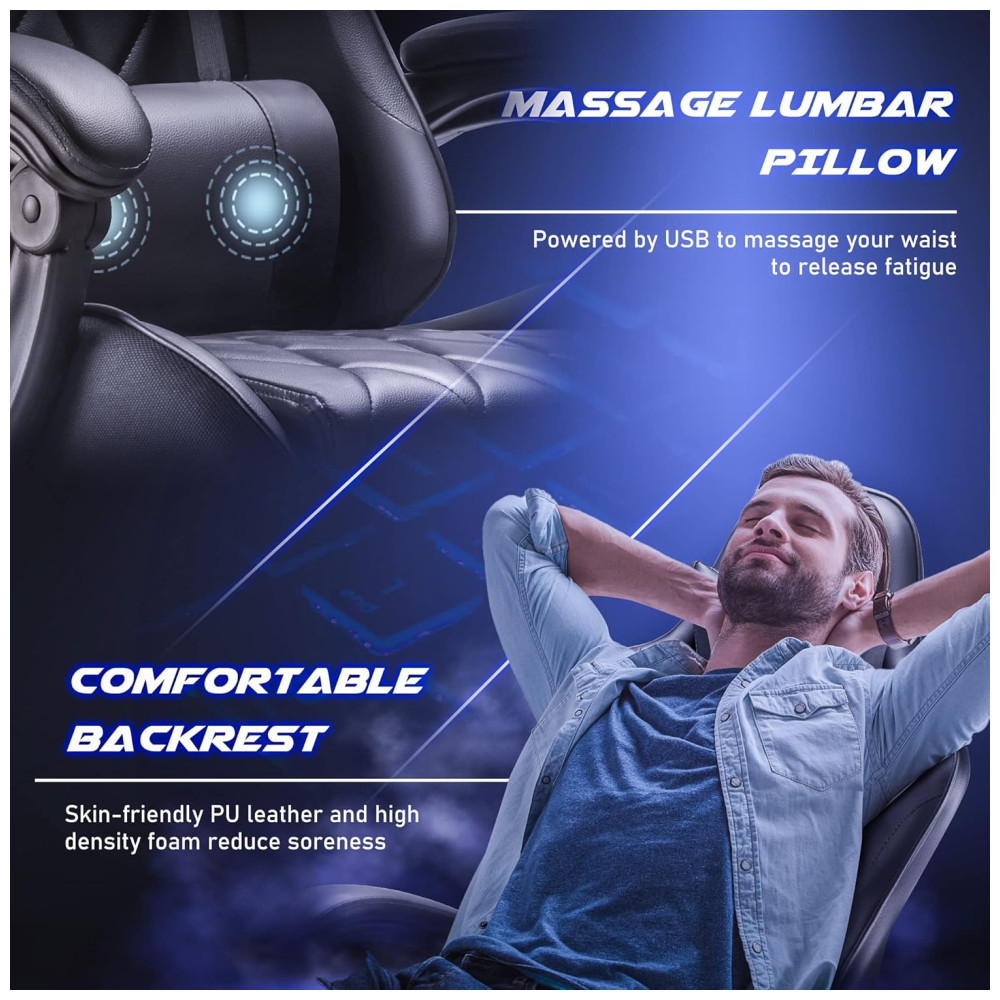 Excelente conforto esta cadeira de jogos de computador possui apoio de cabeça e almofada lombar de massagem. Quando seu pescoço fica dolorido por longas horas de trabalho ou jogos, o encosto de cabeça pode ajudar a aliviar a dor. Quando sentir dor na cintura por estar sentado na mesma posição, abra a função de massagem do apoio lombar e deixe o aliviar a fadiga.
