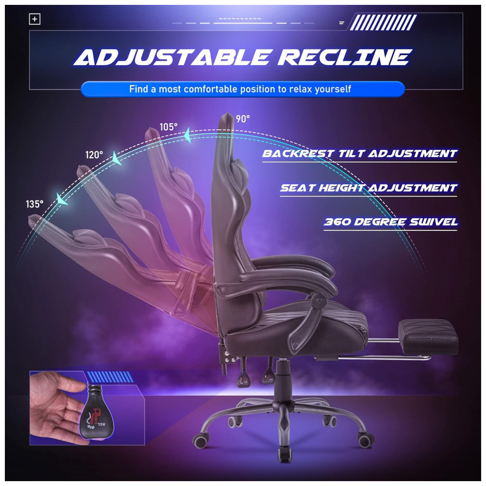 Multifunção Nossa cadeira para jogos com apoio para os pés visa liberar seus pés. Você pode simplesmente tirar o apoio para os pés e colocar os pés para cima com sua música favorita. Rodas giratórias de 360 graus e rodízios suaves podem oferecer qualquer direção que você desejar. A reclinação de 90 135 é adequada para trabalhar, ler, jogar ou tirar uma soneca. A função de ajuste de altura também está incluída.