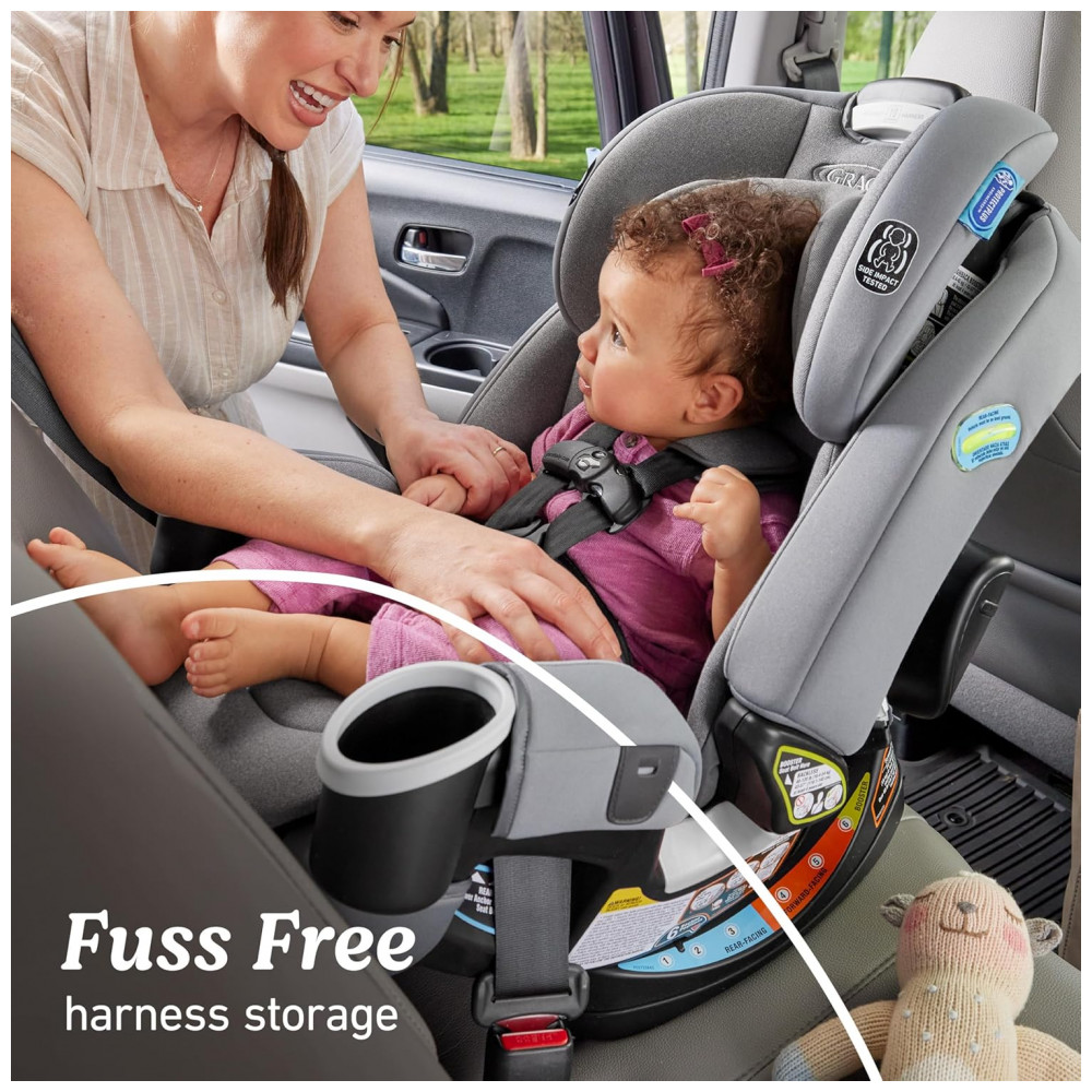 A Graco 4Ever DLX é uma cadeira para carro conversível 4em1 projetada para uso prolongado de 10 anos, transformando-se de rear-facing (4-18 kg) para forward-facing (12-29,5 kg), highback booster (18-45 kg) e backless booster (18-54 kg). Oferece ajustes simultâneos de cinto e encosto de cabeça em 10 posições, reclinação em 6 posições e sistema InRight LATCH para instalação rápida com clique audível.