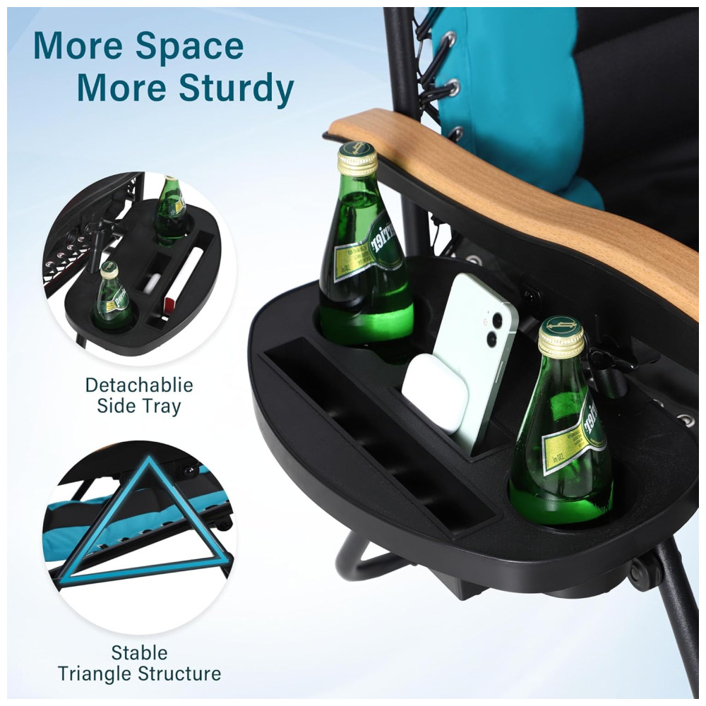 Design ergonômico acolchoado O design ergonômico com assento totalmente acolchoado, travesseiro destacável e apoio de braço com padrão de madeira proporcionam extremo conforto e aliviam o estresse. Uma bandeja de porta copos lateral removível para acessibilidade conveniente. Ideal para desfrutar do seu tempo interior e exterior. Faz uma excelente adição ao quarto, varanda, jardim e pátio. Perfeito para camping com motor house, férias na praia ou descanso à beira da piscina