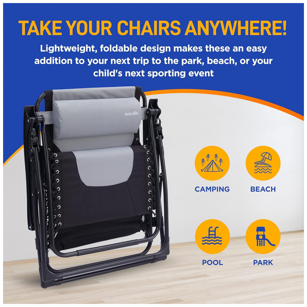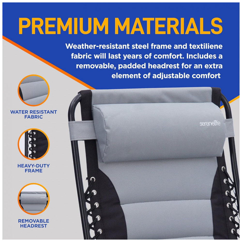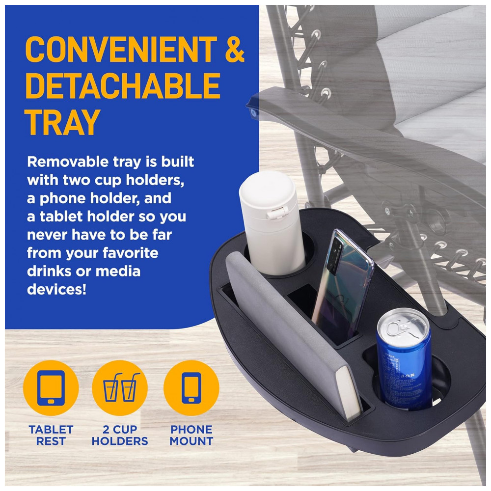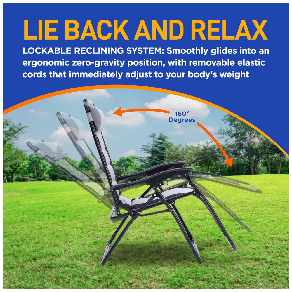 Almofadas de encosto de cabeça acolchoadas removíveis e confortáveis nosso conjunto de cadeiras de gravidade zero foi feito para conforto. Ele vem com almofadas acolchoadas removíveis para o apoio de cabeça, mesa lateral com 2 porta copos, assento acolchoado e tecido respirável que é relaxante de usar.