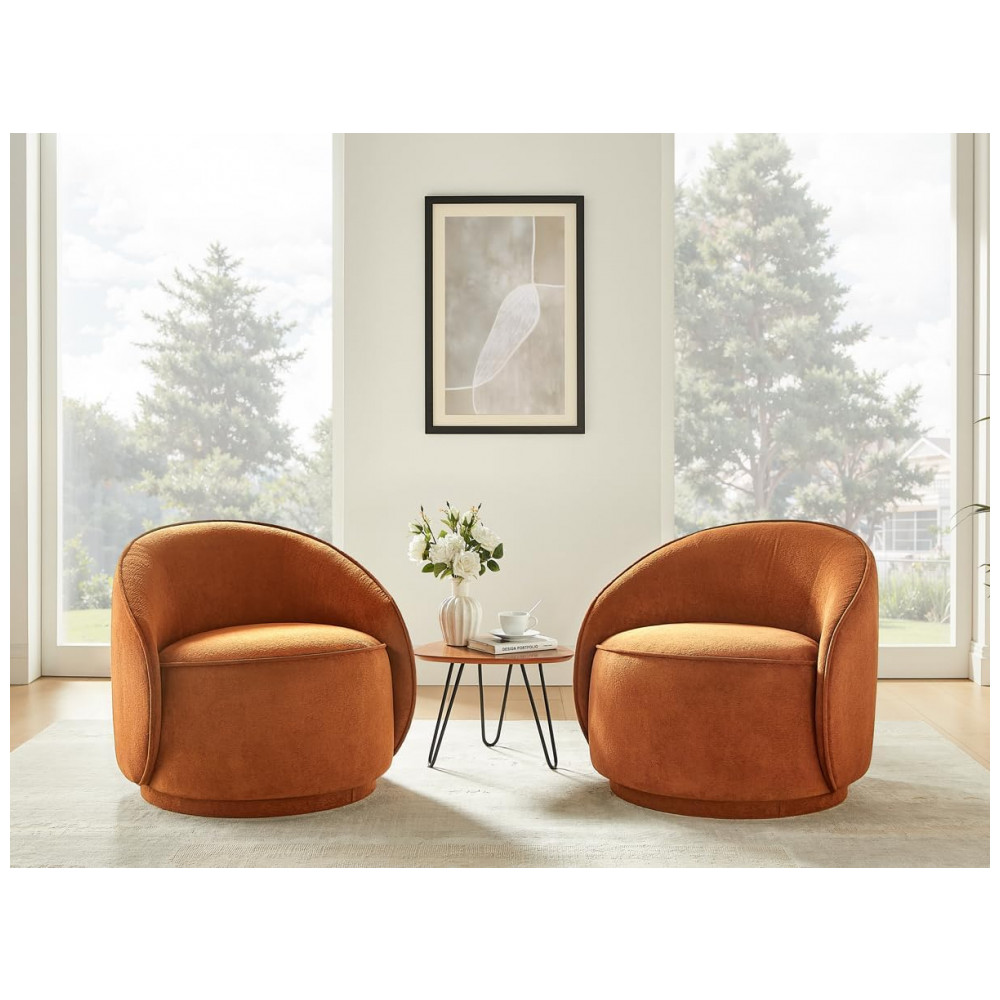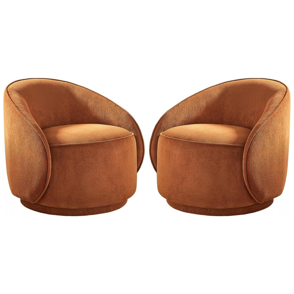 O conjunto de cadeiras giratórias Arcrinte é composto por duas poltronas tipo barrel em tecido peluciado na cor curry, com base giratória de 360° e estrutura interna dimensionada para uso em salas, quartos e áreas de leitura. O assento acolchoado em espuma, encosto contínuo e braços arredondados integrados oferecem apoio ao tronco e aos braços em um formato compacto de aproximadamente 84 cm de profundidade, 76 cm de largura e 71 cm de altura.