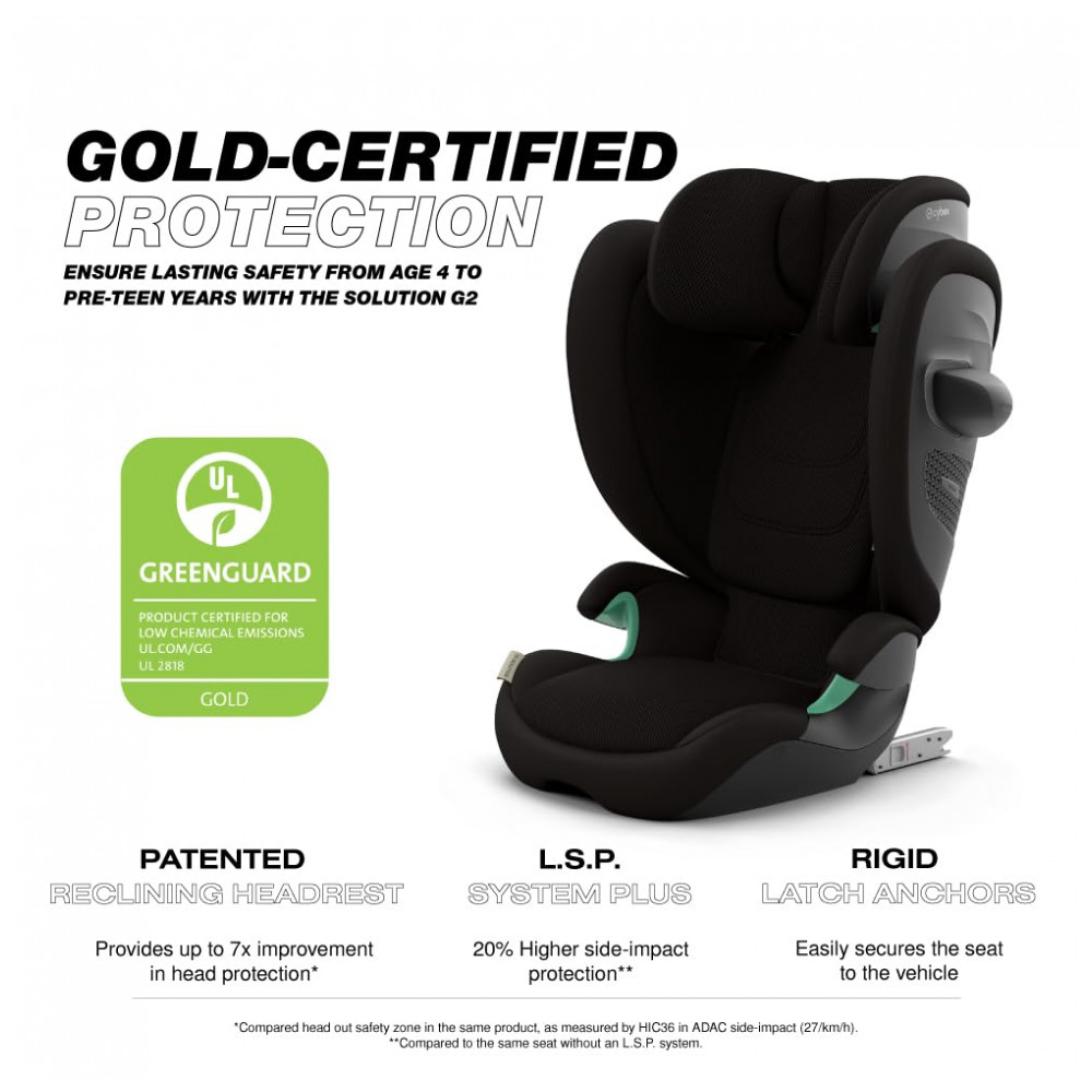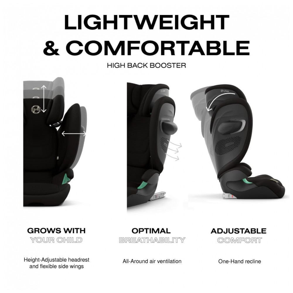 Cadeirinha booster alta costas Cybex Solution G2 Moon Black oferece estrutura dobrável para armazenamento compacto, instalação rígida via Latch e proteção lateral linear com sistema L.S.P. Plus integrado à casca absorvedora de energia e encosto de cabeça reclinável. Projetada para uso em veículos com orientação forward-facing, suporta crianças em fase de transição de assentos com arnês para booster, com peso máximo de 54 kg e ajuste de altura em 3 posições. Ideal para viagens, ocupa até 1/3 menos espaço quando dobrada, compatível com bagageiro de carro ou compartimento superior de aeronave.