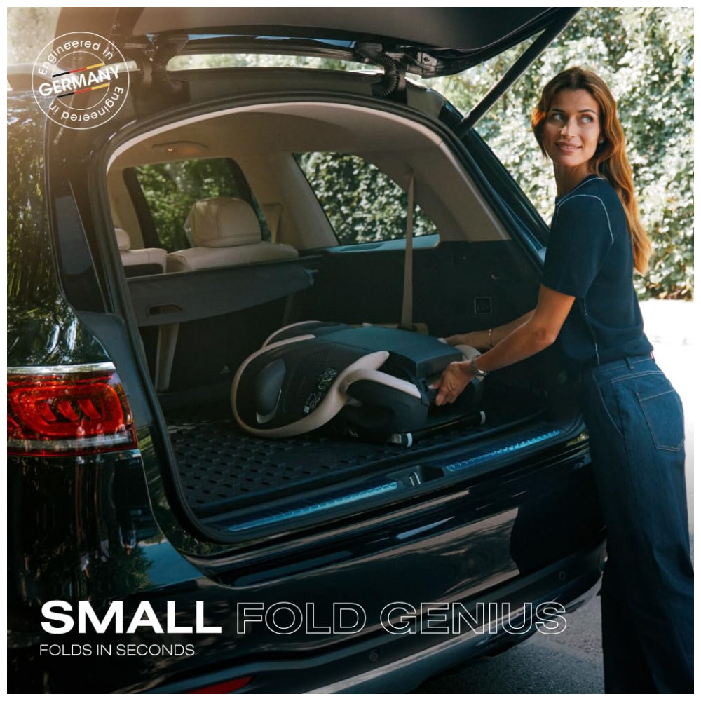 Asas laterais flexíveis expandem para maior espaço; dobra em segundos para portabilidade. Compatível com veículos equipados com sistema Latch; orientação forward-facing apenas.