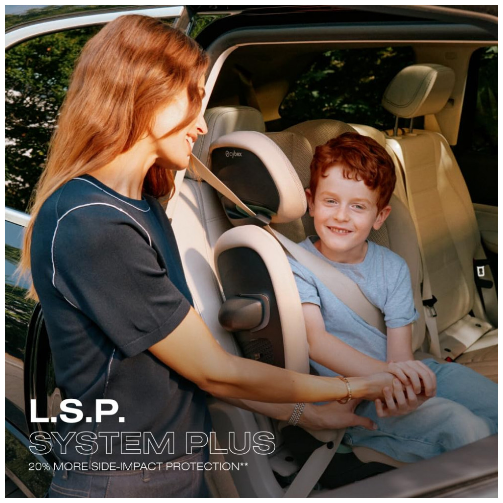 Sistema L.S.P. Plus combinado à proteção linear de impacto lateral, trabalhando com casca e encosto de cabeça. Arnês de 5 pontos em configuração inicial, convertível para booster sem arnês. Instalação via Latch rígido.