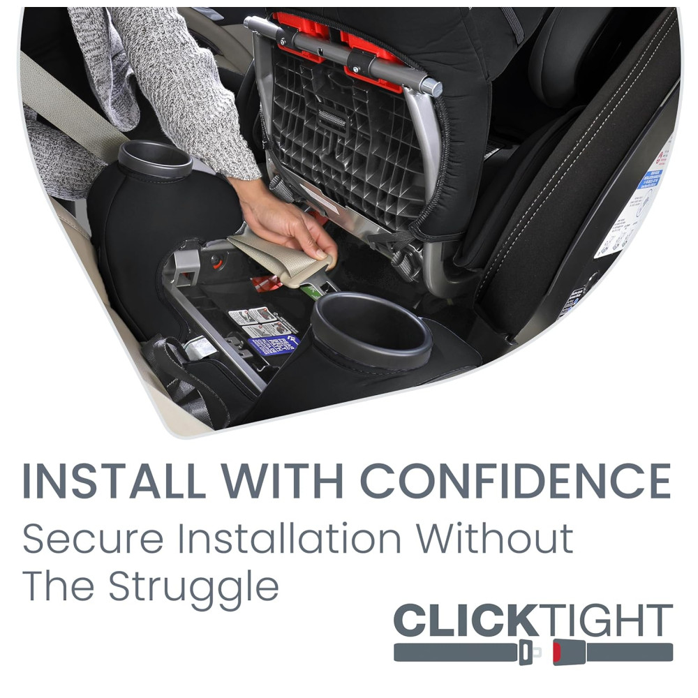 Instalação fácil com a tecnologia ClickTight®: basta abrir a cadeirinha, passar o cinto de segurança, fechar e clicar no lugar.