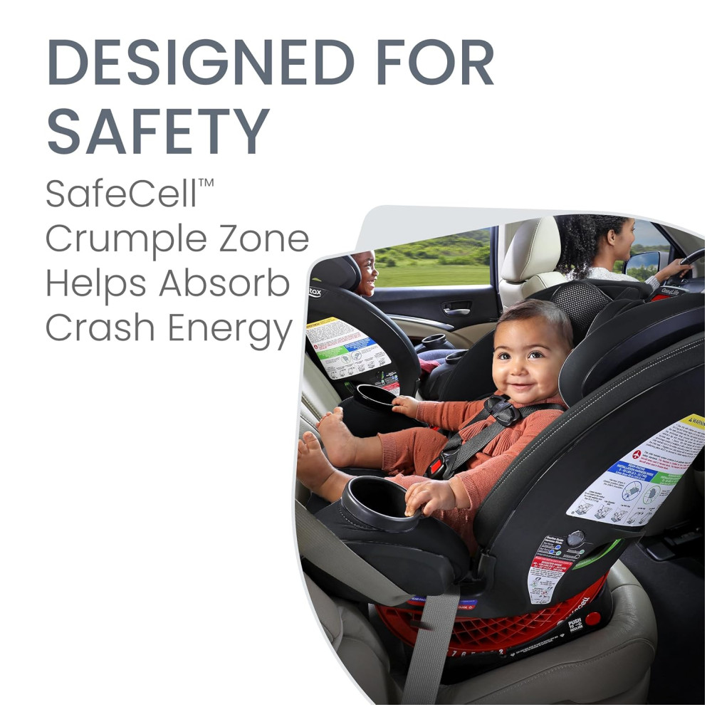 Segurança confiável com estrutura de aço, zona de deformação SafeCell™, anexo patenteado em formato V e duas camadas de gerenciamento de energia para proteção adicional.