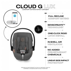 A cadeirinha de bebê para carro CYBEX Cloud G Lux Comfort Extend leva a segurança e o conforto a sério, com uma concha que absorve energia, base antirreflexo e Proteção Linear contra Impactos Laterais. A instalação LATCH de clique único, simples e confiável, e o fecho fácil garantem um carregamento e descarregamento seguros e sem complicações. A Cloud G apresenta uma posição de recline total e apoio para pernas estendido para uma posição confortável e ergonômica ao ser usada fora do veículo. Ventilação de ar na concha e um grande dossel UPF50 protegem seu filho dos raios solares e proporcionam fluxo de ar natural. Todos os tecidos do assento são laváveis à máquina para facilitar a limpeza. Um inserto removível para recém-nascidos e apoio de cabeça ajustável em 12 posições permitem o uso adequado desde o nascimento até 35 libras, cerca de 18 meses de idade, e a Cloud G é compatível com todos os carrinhos CYBEX para criar um conveniente sistema de viagem para bebês para sua família. Modo Conforto com 45% mais recline para uma posição confortável e ergonômica ao ser usada fora do veículo INSTALAÇÃO LATCH RÍGIDA DE CLICAR UMA VEZ Instalação rápida, simples e segura em 5 segundos BASE DE PERNA DE APOIO Absorve energia e reduz as forças de impacto na criança em até 30 TECNOLOGIA SENSORSAFE Clipe de peito ativado por Bluetooth que envia alertas para o aplicativo móvel se a criança desafivelar o clipe do peito, se o banco traseiro ficar muito quente ou muito frio, e se o motorista esquecer a criança no carro BASE ANTIRREFLEXO Reduz as forças na criança em até 30 em um impacto traseiro ou frontal