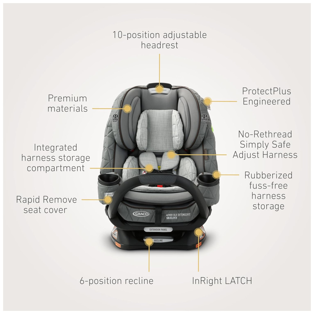 A coleção Graco Premier Midtown é feita com materiais e design premium. A Cadeirinha de Carro 4 em 1 Graco Premier 4Ever DLX Extend2Fit SnugLock, com Barra Anti-Rebote, oferece 10 anos de uso em um único assento de carro e instala em menos de um minuto com a Tecnologia SnugLock. A cadeirinha 4 em 1 faz a transição de um assento traseiro com cinto de segurança de 2,04 kg para um assento frontal com cinto de segurança de 10,25 kg, para um reforçador de posição de cinto alto de 18,14 a 45,36 kg e para um reforçador sem encosto de 18,14 a 54,43 kg. A barra anti-rebote fornece uma camada adicional de segurança traseira limitando a rotação do assento e da criança em caso de impacto. O painel de extensão com 4 posições do Extend2Fit fornece até 12,7 cm de espaço adicional para as pernas voltado para trás, permitindo que a criança viaje com segurança nessa posição por mais tempo, até 22,68 kg. A cadeirinha de carro é Graco ProtectPlus Engineered para ajudar a proteger a criança em impactos frontais, laterais, traseiros e capotamento. A coleção Graco Premier Midtown é feita com materiais e design premium. A cadeirinha 4 em 1 oferece 10 anos de uso, transição suave de traseira com cinto de segurança de 2,04 kg, frontal com cinto de segurança de 10,25 kg, reforçador de cinto alto de 18,14 a 45,36 kg e reforçador sem encosto de 18,14 a 54,43 kg. A tecnologia SnugLock instala em menos de um minuto usando o cinto do veículo ou LATCH. A Barra Anti-Rebote oferece uma camada adicional de segurança traseira limitando a rotação do assento e da criança em caso de impacto. O painel de extensão ajustável com 4 posições fornece até 12,7 cm de espaço adicional para as pernas, permitindo que a criança viaje com segurança por mais tempo na posição voltada para trás. Com capacidade de até 22,68 kg voltada para trás, permitindo que a criança viaje com segurança nessa posição por mais tempo. Graco ProtectPlus Engineered, uma combinação dos testes de colisão mais rigorosos, ajuda a proteger seu pequeno em impactos frontais, laterais, traseiros e capotamento. Sistema de arnês Simply Safe Adjust sem a necessidade de remontagem permite que o apoio de cabeça e o arnês sejam ajustados juntos em um único movimento. Escolha a altura perfeita do apoio de cabeça em 10 posições para obter o ajuste mais seguro para seu filho à medida que cresce. O reclinador de 6 posições mantém seu filho confortável e auxilia em uma melhor instalação.