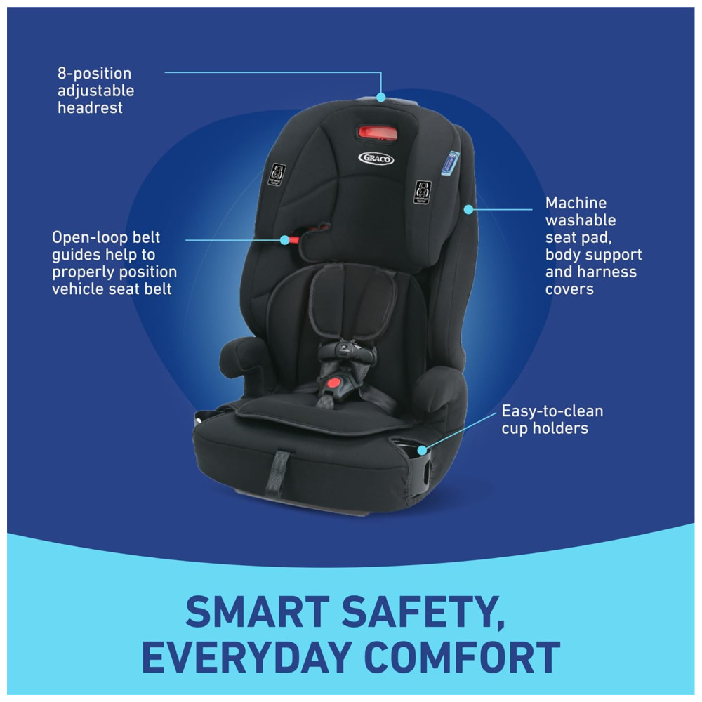 A Cadeirinha de Carro Graco Tranzitions 3 em 1 foi projetada para acompanhar o crescimento da criança e te acompanhar em todas as jornadas, do carro à carona e além. Esta cadeirinha leve transita perfeitamente de booster com arnês de 13 a 25 kg, a booster de encosto alto de 18,1 a 45,3 kg, e sem encosto de 18,1 a 45,3 kg. Possui o Sistema de Arnês Simply Safe Adjust, que ajusta o arnês e o apoio de cabeça em 9 posições de altura, sem a necessidade de rosquear novamente. Conta com dois porta-copos giratórios para manter a criança feliz, capa de assento lavável na máquina e protetores de arnês. Para continuar atendendo aos padrões da indústria, aumentamos o peso mínimo de 13,6 para 18,1 kg. O booster 3 em 1 ajuda a proteger seu filho, desde a infância até a juventude, crescendo junto com a criança de booster voltado para frente de 13 a 25 kg a booster com encosto alto de 18,1 a 45,3 kg e sem encosto de 18,1 a 45,3 kg. O Sistema de Arnês Simply Safe Adjust sem a necessidade de rosquear permite ajustar o apoio de cabeça e o arnês juntos em um único movimento. O assento portátil e leve é ideal para pais ocupados e ativos. O apoio de cabeça ajustável com uma mão em 9 posições cresce com seu filho.
