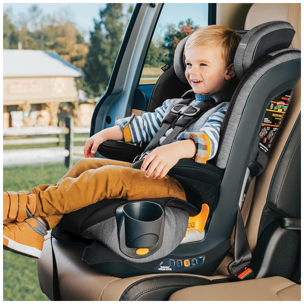 Para o conforto da criança, o assento é profundo e conta com espuma de dupla densidade, encosto com apoio de cabeça ajustável em vários níveis e inclinação regulável para diferentes posturas de viagem. Dois porta-copos laterais rebatíveis podem ser recolhidos para economizar espaço quando não estiverem em uso. As capas têxteis são removíveis e laváveis, facilitando a manutenção periódica de limpeza.
