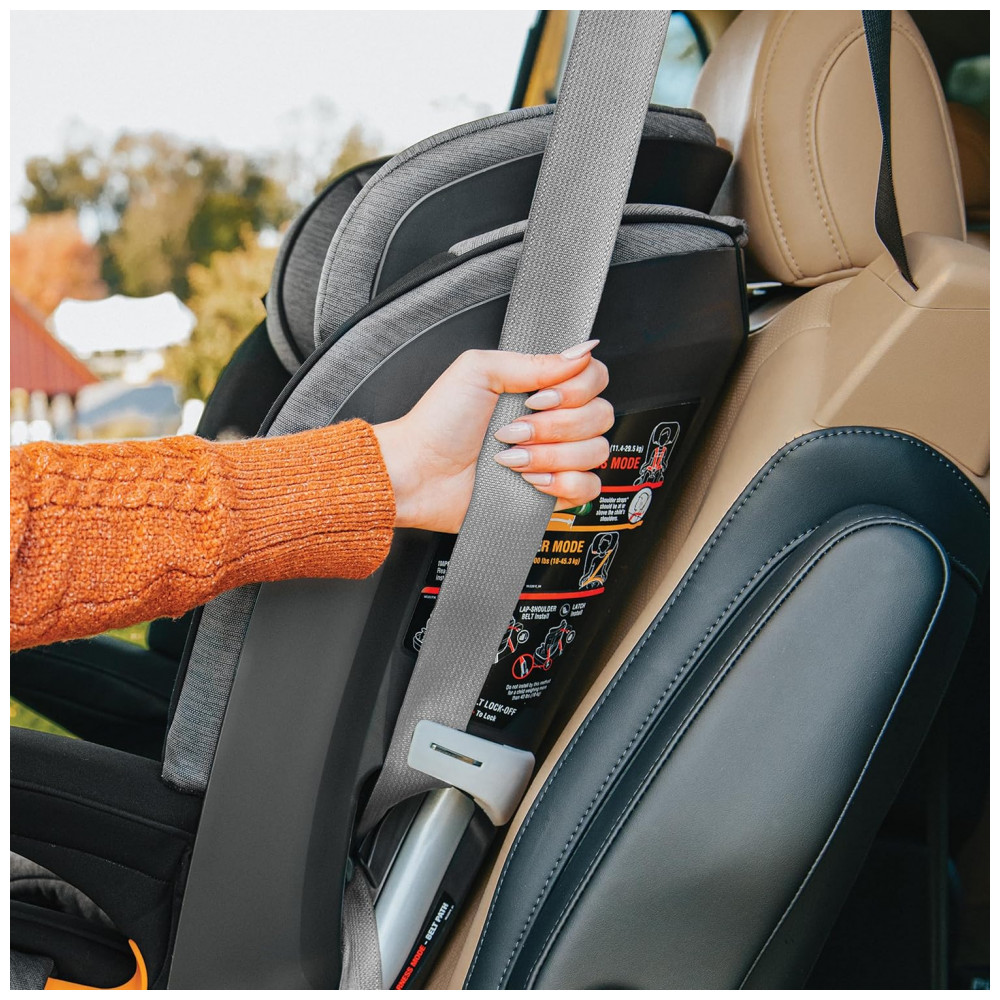 Equipada com conectores LATCH premium, sistema LockSure para tensionamento do cinto e níveis de bolha RideRight para ajuste correto. O assento ErgoBoost com espuma de dupla densidade e recuo em 4 posições oferece suporte ergonômico. Suporta 9 posições de apoio de cabeça ajustável manualmente.
