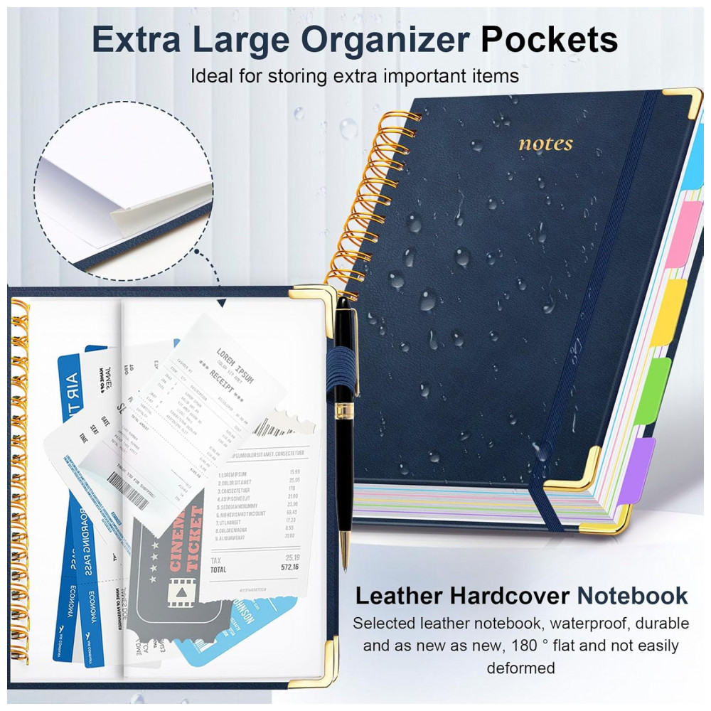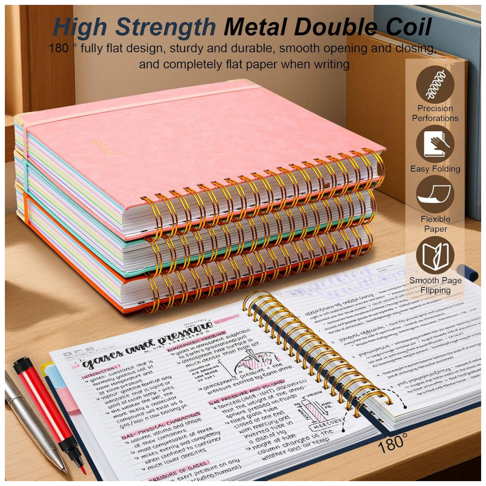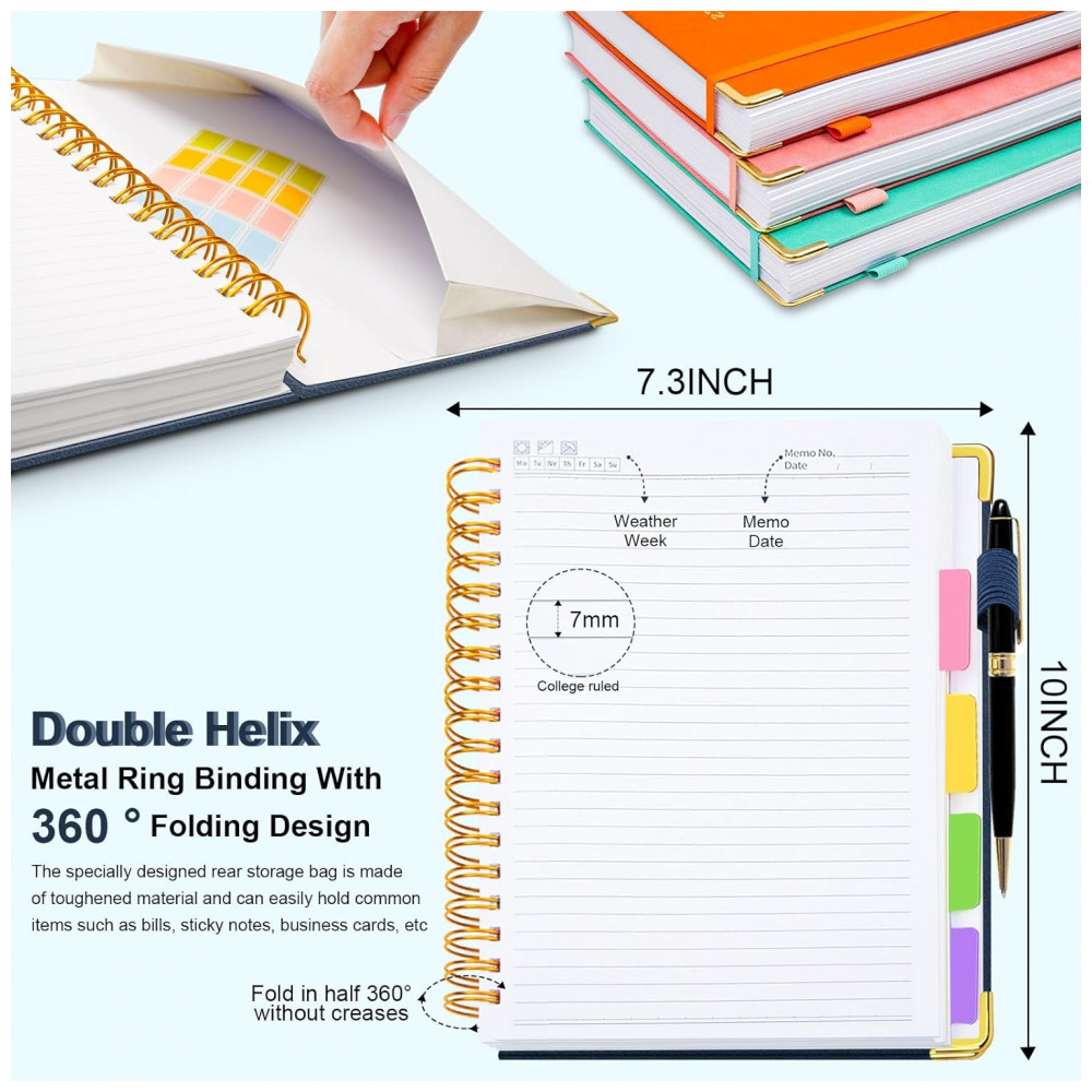 Este caderno universitário espiral GDGDSY em formato B5 8 x 10 reúne 5 seções em um único volume com 300 páginas pautadas, adequado para anotações em rotinas escolares, acadêmicas e profissionais. A capa dura em couro sintético com cantos metálicos dourados reforçados foi desenvolvida para proteger o miolo contra desgaste e manuseio frequente.