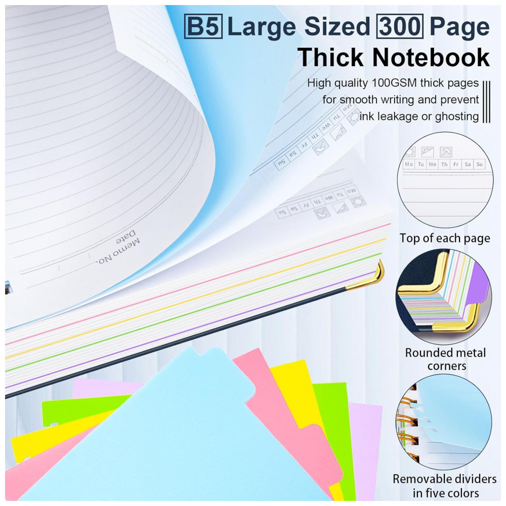 Caderno universitário espiral capa dura GDGDSY B5 8×10 5 matérias 300 páginas pautadas divisórias removíveis capa couro sintético azul escuro