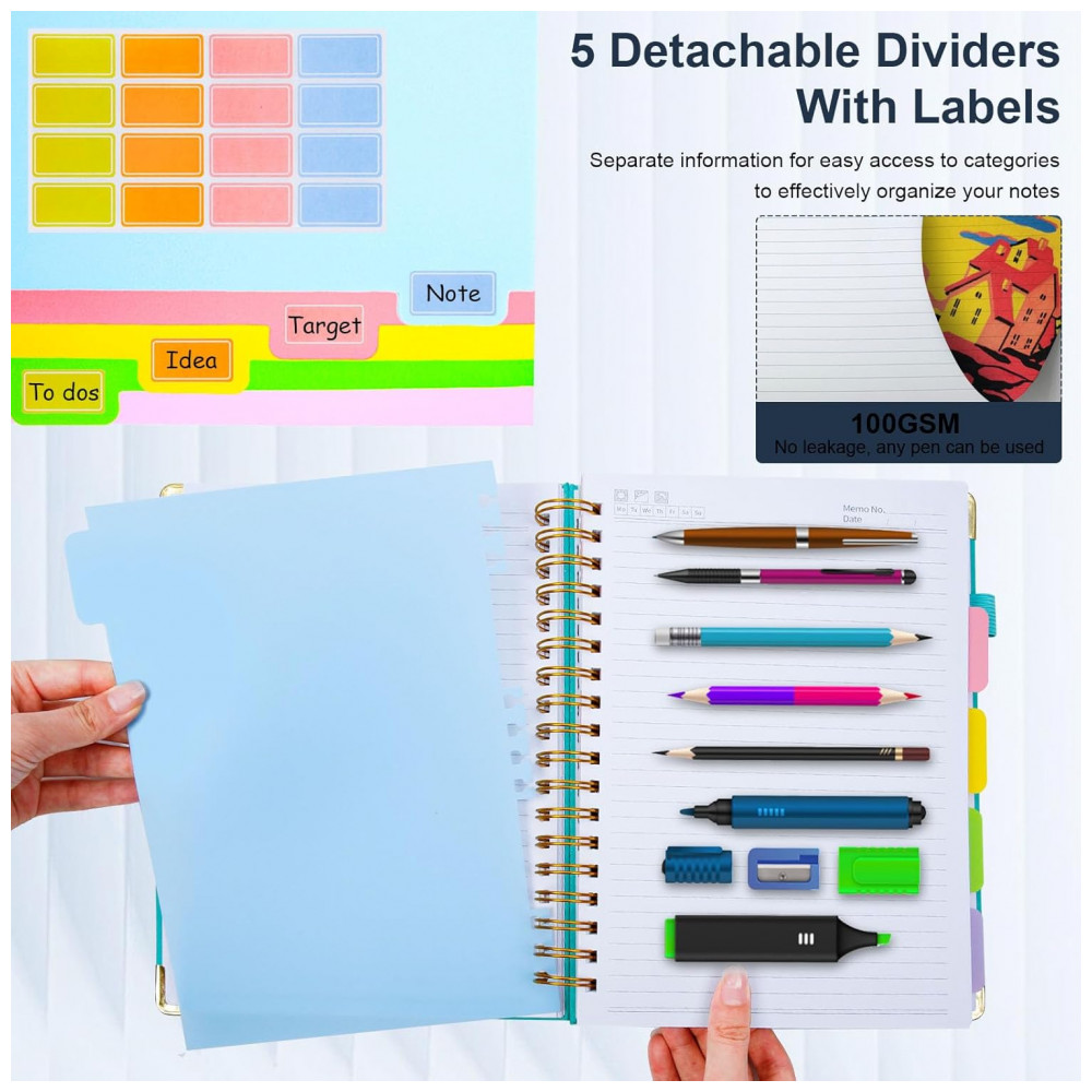 O sistema de organização com 5 divisórias móveis e 8 etiquetas autoadesivas possibilita separar matérias, projetos ou categorias em um único caderno. As folhas utilizam papel mais espesso, projetado para reduzir marcas de tinta no verso, favorecendo o uso de ambos os lados da folha em anotações contínuas.