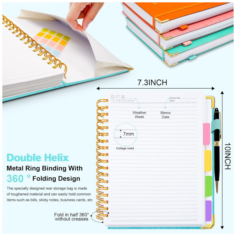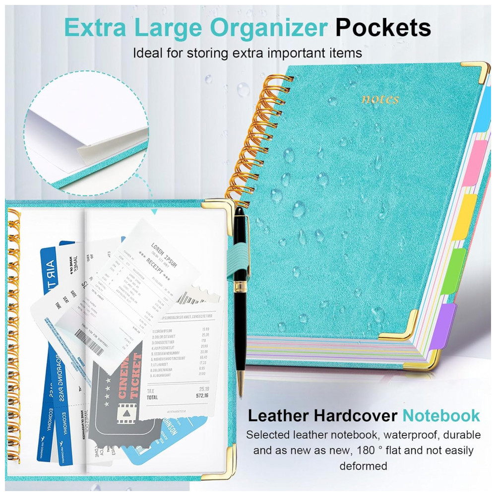 Este caderno universitário espiral GDGDSY em formato B5 8 x 10 reúne 5 seções em um único volume com 300 páginas pautadas, adequado para anotações de estudo, trabalho e planejamento pessoal. A capa dura em couro sintético com cantos metálicos dourados reforçados protege o conteúdo contra desgaste no uso diário.