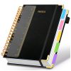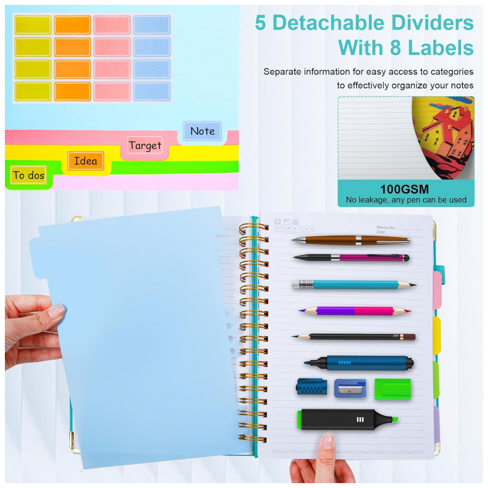 O sistema com 5 divisórias móveis e 8 etiquetas autoadesivas possibilita segmentar diferentes matérias, projetos ou áreas de trabalho. As folhas utilizam papel mais espesso, projetado para reduzir marcas de tinta no verso, favorecendo o uso de ambos os lados da página em rotinas intensas de anotação.