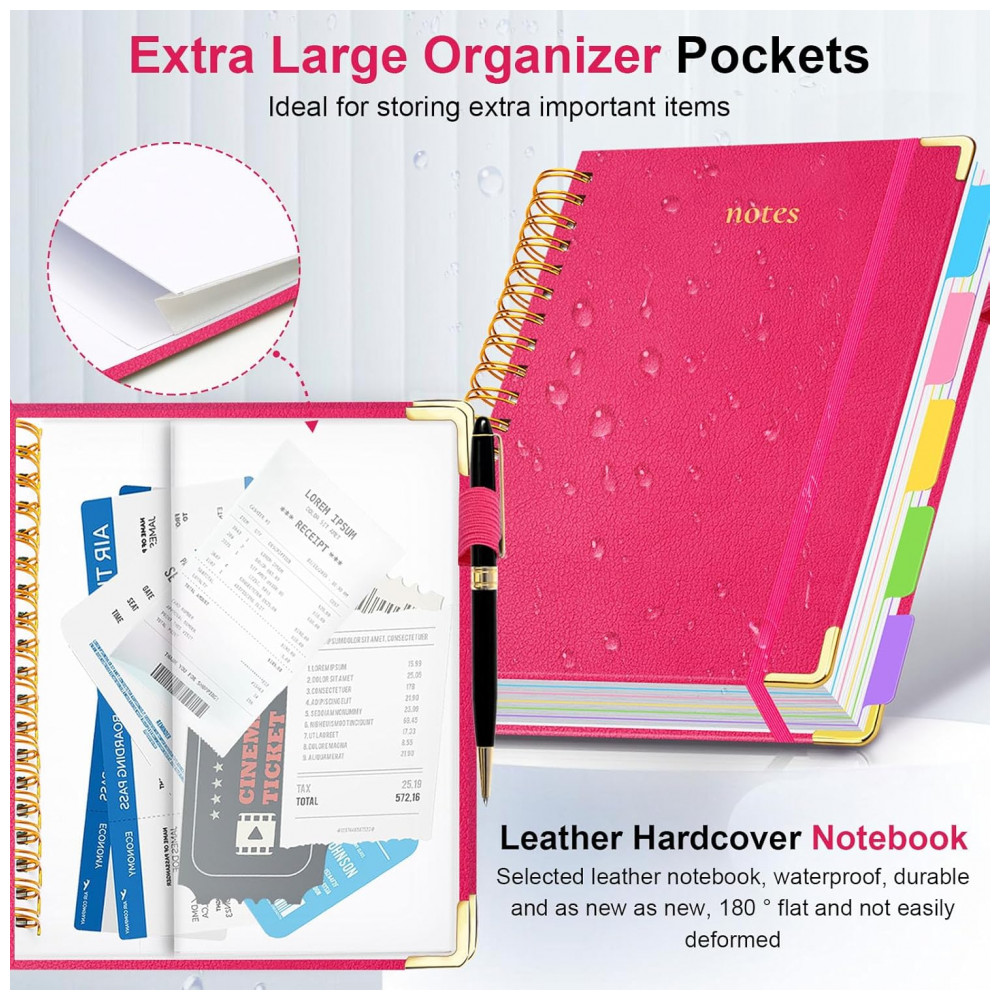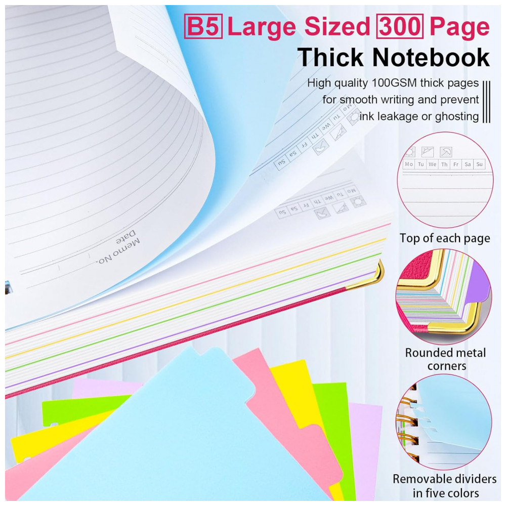 Caderno universitário espiral capa dura GDGDSY B5 8×10 5 matérias 300 páginas pautadas divisórias removíveis capa couro sintético rosa choque