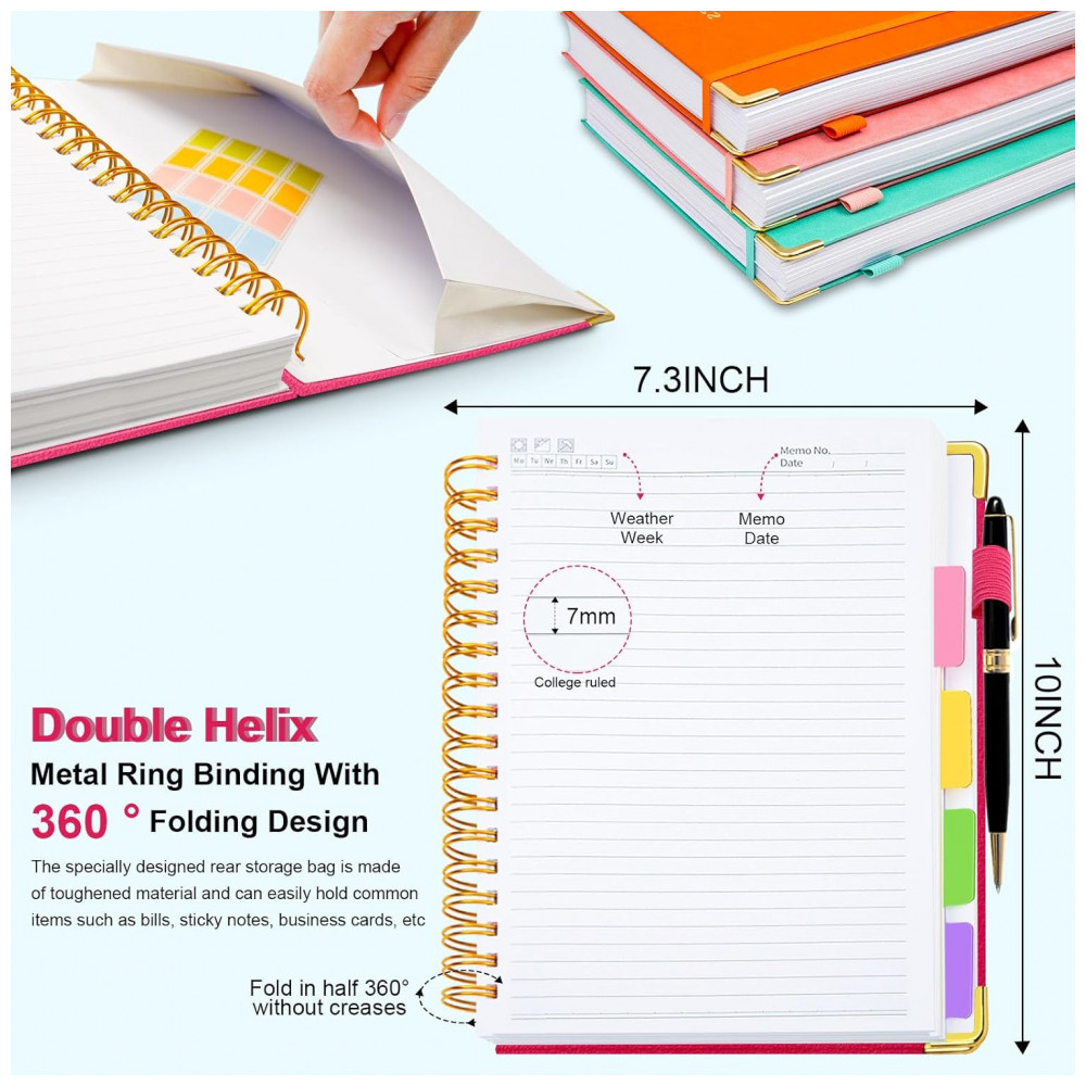Este caderno universitário espiral GDGDSY em formato B5 8 x 10 oferece 5 seções organizadas em um único volume com 300 páginas pautadas, adequado para anotações extensas em estudos, trabalho e planejamento pessoal. A capa dura em couro sintético com cantos metálicos dourados reforçados protege o miolo contra desgaste diário e impactos leves na mochila ou pasta.
