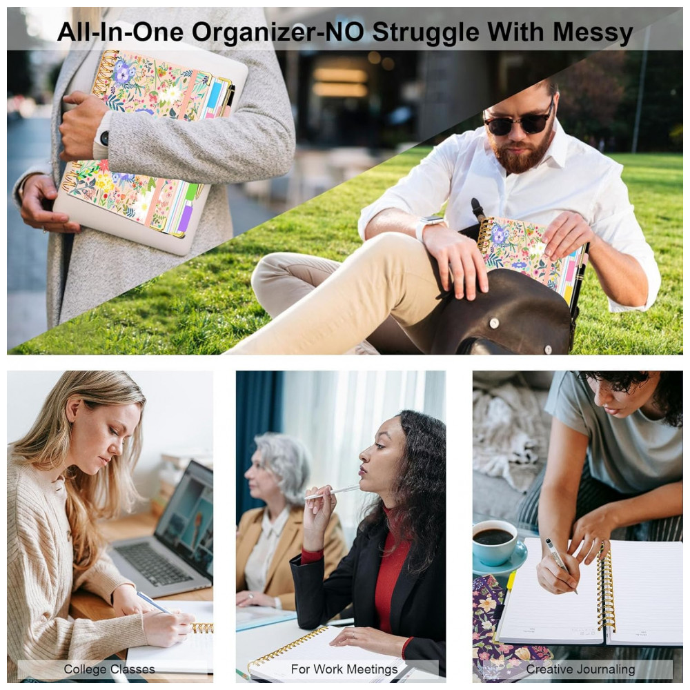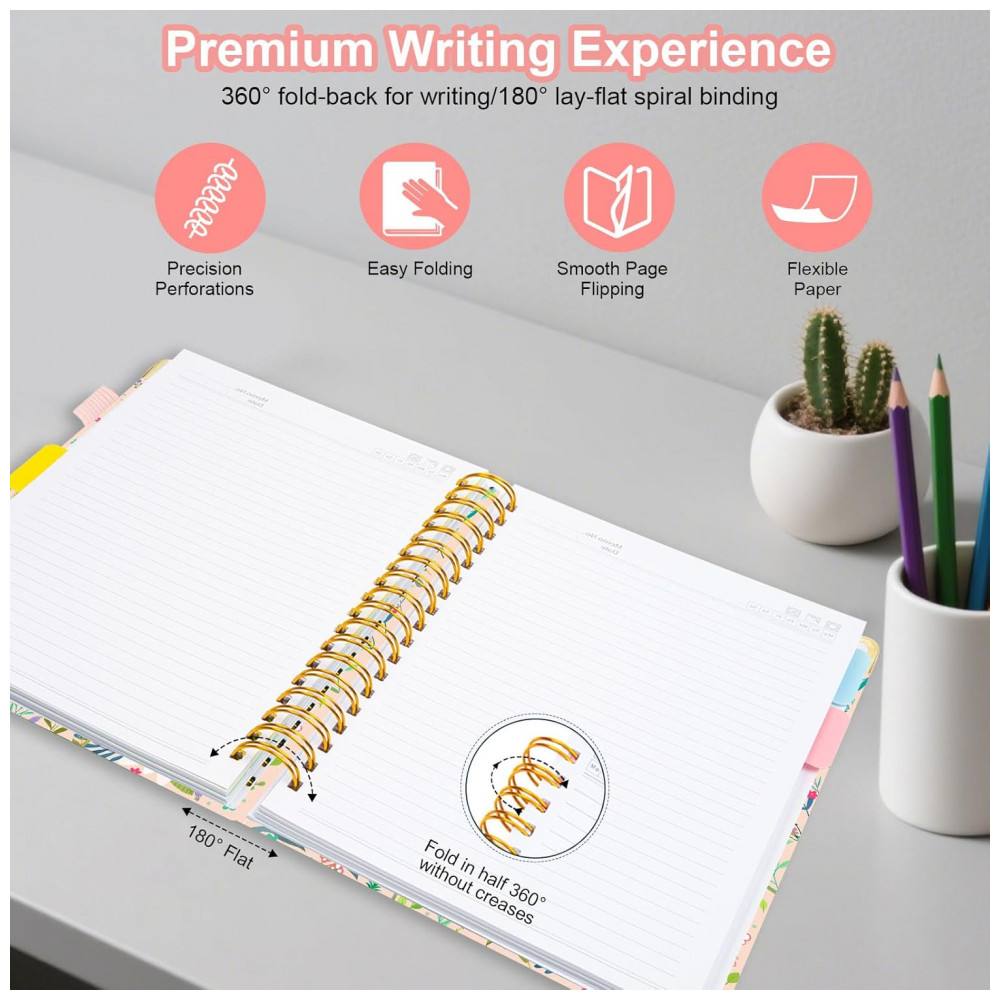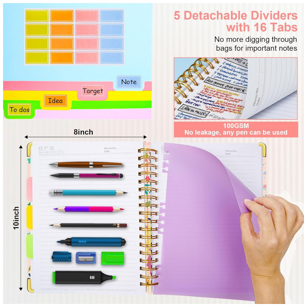 Este caderno universitário espiral HDhuiun em formato 8 x 10 oferece 300 páginas pautadas distribuídas em 5 seções, indicado para anotações extensas de estudo, trabalho e organização pessoal. A capa dura com estampa floral bege é resistente ao desgaste diário e pode ser limpa com facilidade.