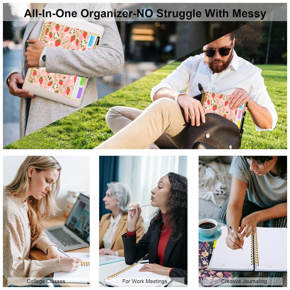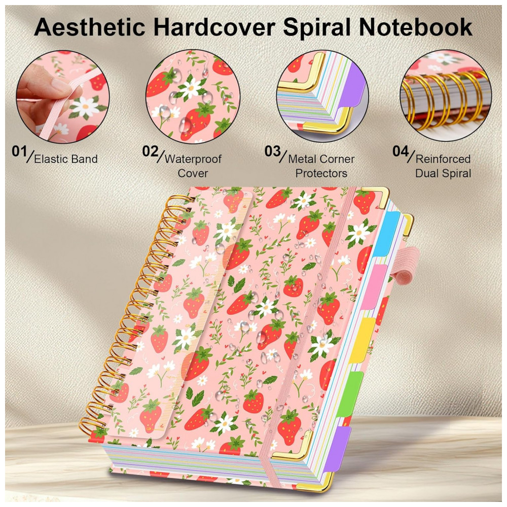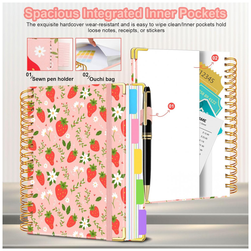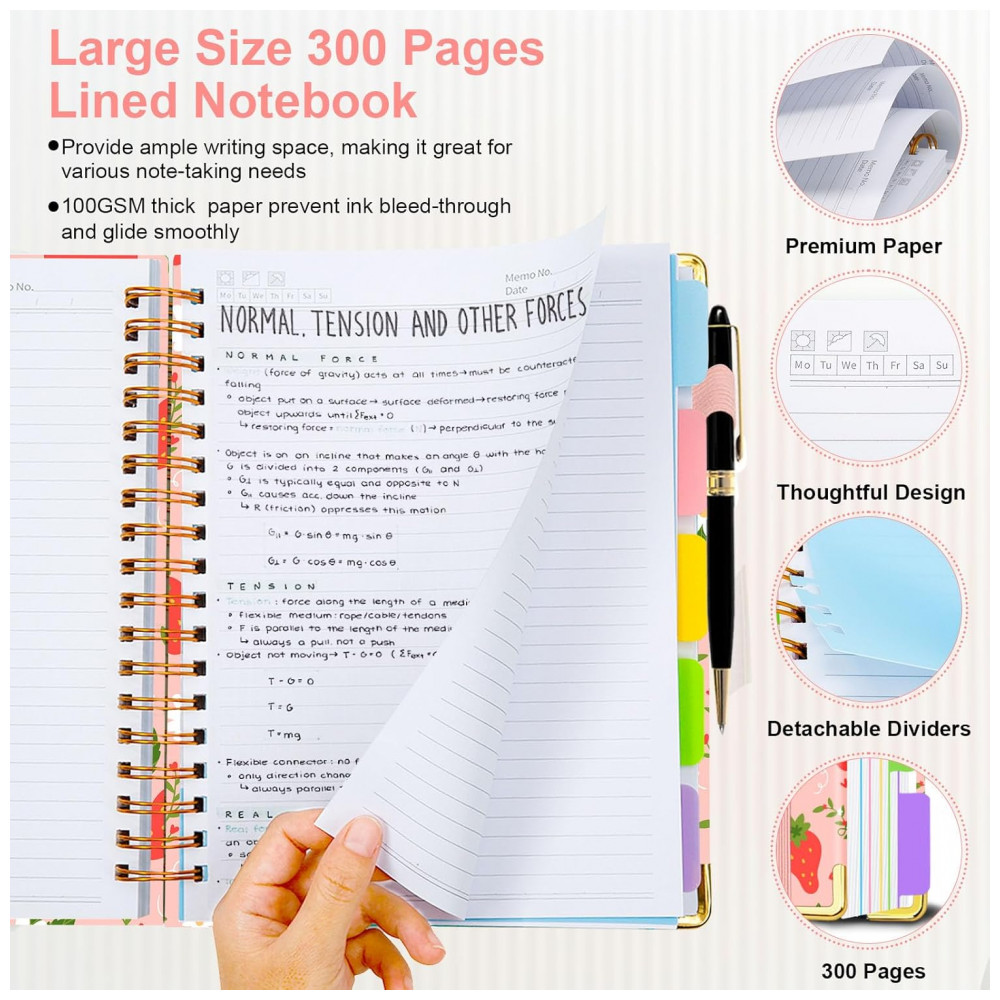 Este caderno universitário espiral HDhuiun em formato 8 x 10 oferece 300 páginas pautadas distribuídas em 5 seções, adequado para anotações em rotinas de estudo, trabalho e organização pessoal. A capa dura rosa com estampa de morangos é resistente ao uso diário e pode ser limpa com facilidade.
