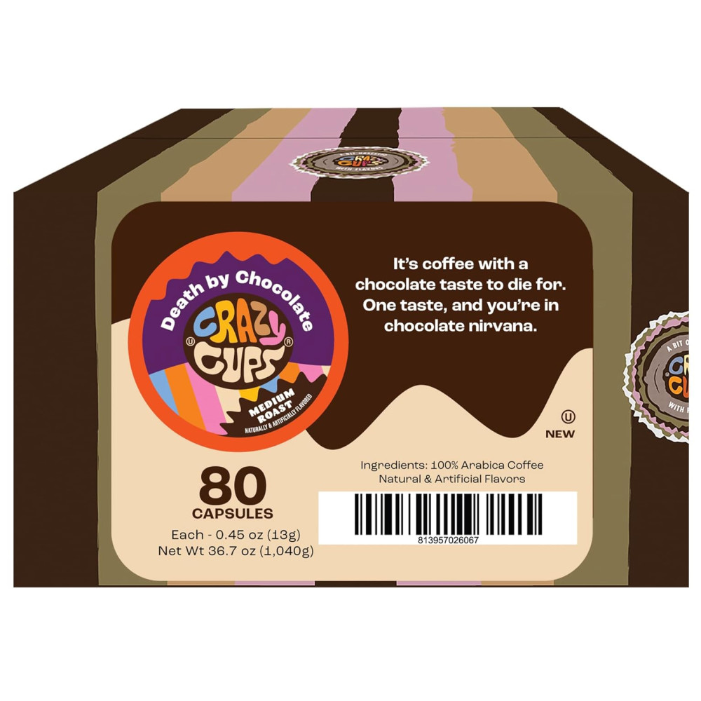 Copos loucos com sabor de café para máquinas Keurig K Cup, morte por chocolate, bebidas quentes ou geladas, 80 doses individuais, cápsulas recicláveis