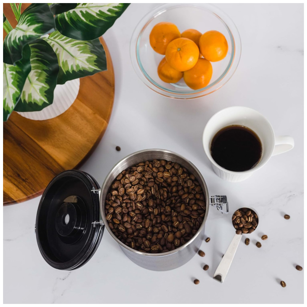 Mostrador de data inteligente que ajuda você a acompanhar o frescor do seu café Nunca se esqueça de quando é hora de comprar um café com o design do mostrador de data inteligente na tampa. Recipiente de zenamento de café hermético vem com uma colher extra projetada para conter exatamente a quantidade de terra você precisa de café para duas deliciosas xícaras de expresso forte