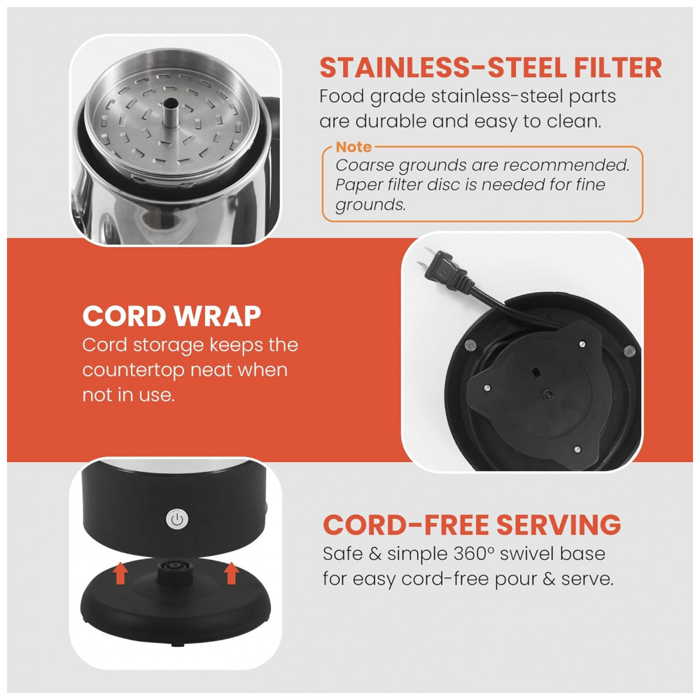 ZENAMENTO DO CABO ENVOLVENTE e pés antiderrapantes, bem como base giratória de 360 para facilitar o serviço sem fio na mesa. Isso torna o Coador totalmente portátil e você pode servir café longe da cozinha, se desejar.
