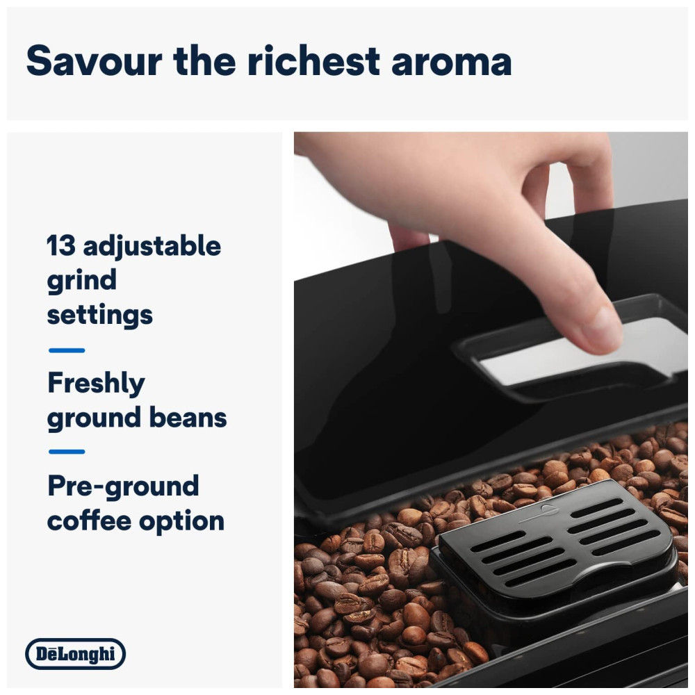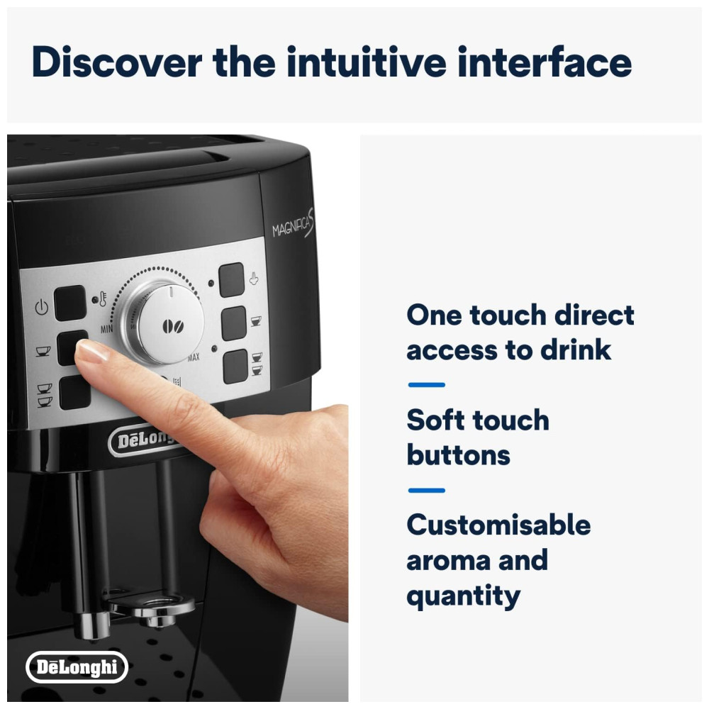 A Magnifica S ECAM22.110B é uma máquina de café expresso DeLonghi compacta e superautomática, que permite preparar sua bebida de café com o toque de um botão. Ela possui um moedor ajustável para grãos frescos, com tecnologia de moagem integrada e nível de moagem ajustável, além de moedores cônicos de aço calibrados com precisão. A máquina mói a quantidade exata de grãos, garantindo que sua xícara seja sempre fresca e sem resíduos de café. É possível personalizar o nível de aroma e quantidade desejado para cada receita. Além disso, ela inclui um recipiente de grãos de 250g e uma caixa para café pré moído. O sistema DeLonghi Thermoblock prepara seu café na temperatura ideal, aquecendo apenas a água necessária para cada bebida. A cafeteira também possui um espumador de leite manual para fazer bebidas à base de leite genuínas, e muitos dos componentes removíveis podem ser lavados na máquina de lavar louça para facilitar a manutenção.