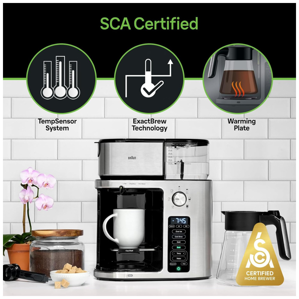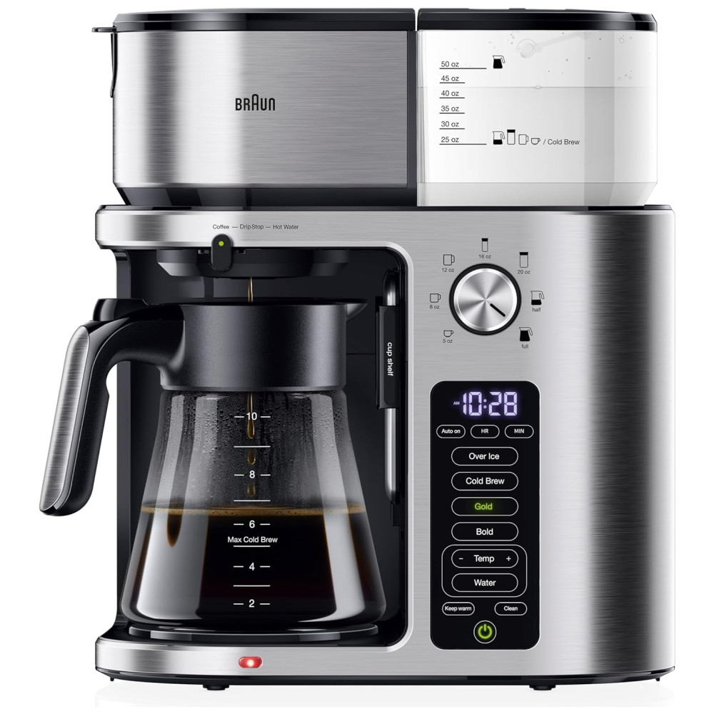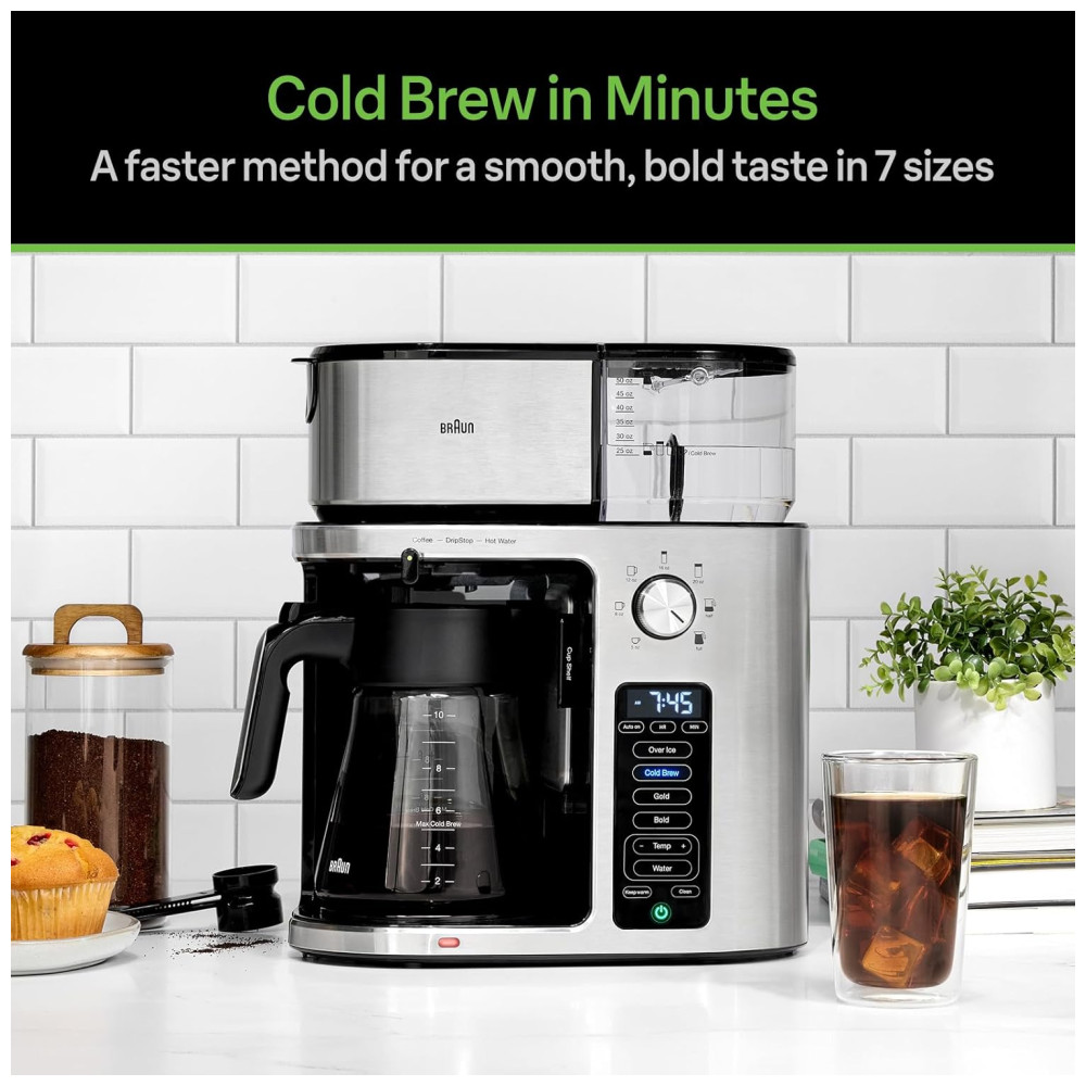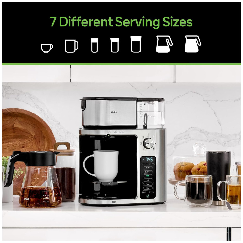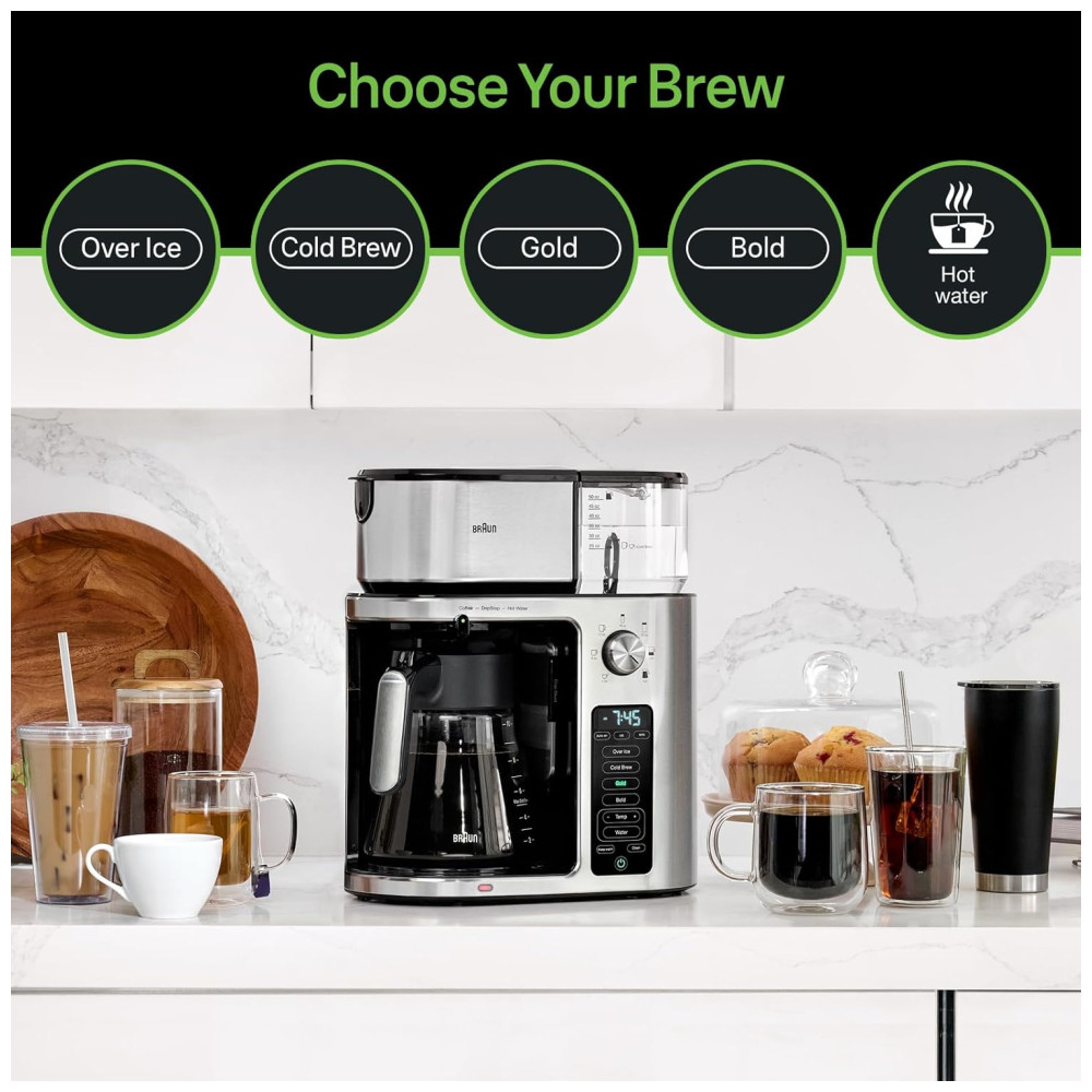 A cafeteira Braun MultiServe Plus é uma máquina de café gota a gota de alta qualidade, com uma longa história de fabricação. Ela é altamente adaptável às necessidades e preferências do usuário, oferecendo opções de dose única ou múltipla e a capacidade de preparar bebidas geladas em apenas alguns minutos. Com o BrewChoice Plus, você pode personalizar seu café ao seu gosto, escolhendo entre configurações Over Ice, Cold Brew, Gold ou Bold com o toque de um botão.