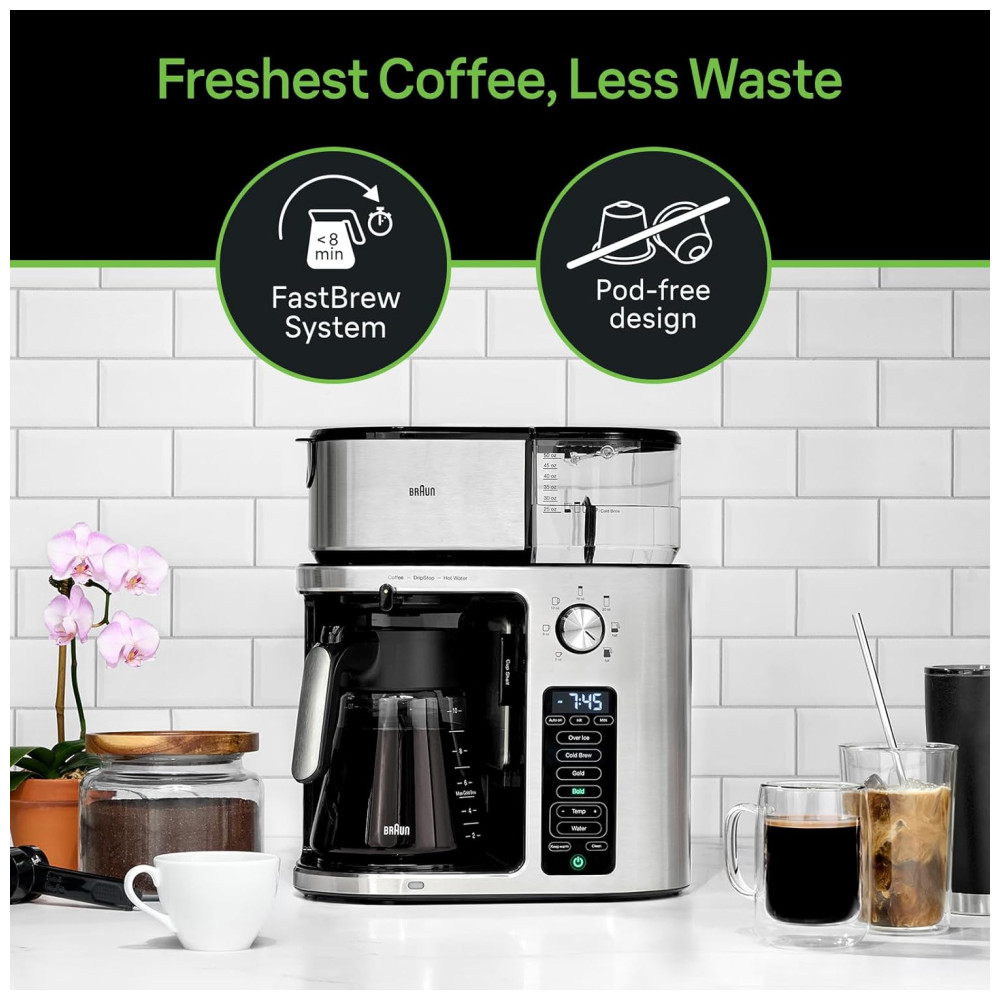 A cafeteira também inclui um dispensador de água quente separado para chá fresco. O design elegante e simplificado em aço inoxidável oferece conveniência e versatilidade sem comprometer a qualidade da bebida. A cafeteira Braun MultiServe Plus é uma maneira mais sustentável e econômica de saborear seu café, pois não utiliza cápsulas. A tecnologia de aquecimento exclusiva FastBrew fornece um bule cheio de café quente em menos de 8 minutos, sem sacrificar o sabor.