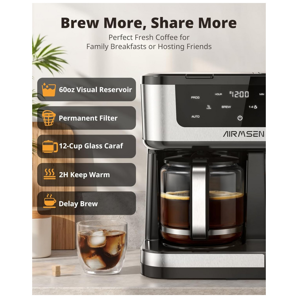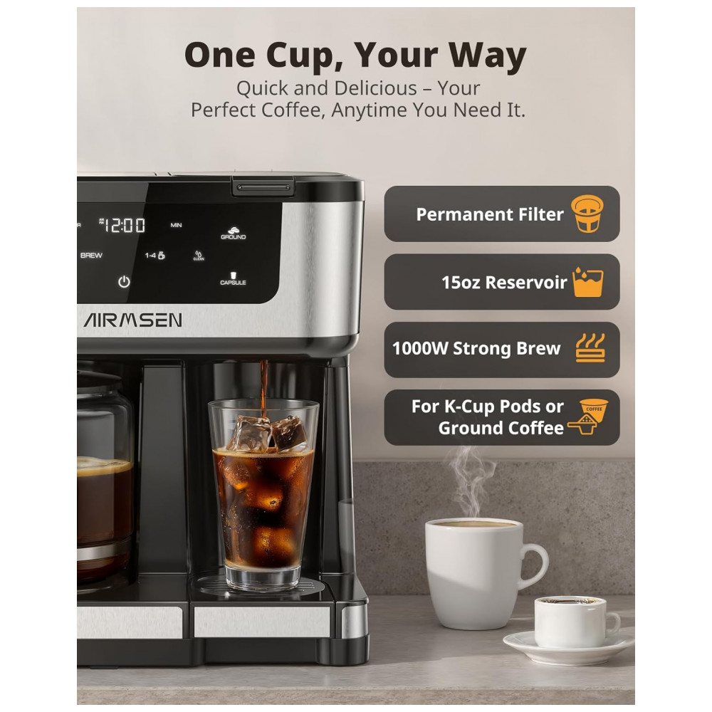 A AIRMSEN HR-CM307U é uma cafeteira elétrica programável com sistema duplo de preparo, permitindo uso em modo jarra de até 12 xícaras ou em modo single serve compatível com cápsulas tipo K-Cup e café moído. O reservatório principal integrado de aproximadamente 1,8 litro abastece o lado multi-serve, enquanto o módulo single serve possui reservatório próprio em torno de 400 ml para doses individuais.