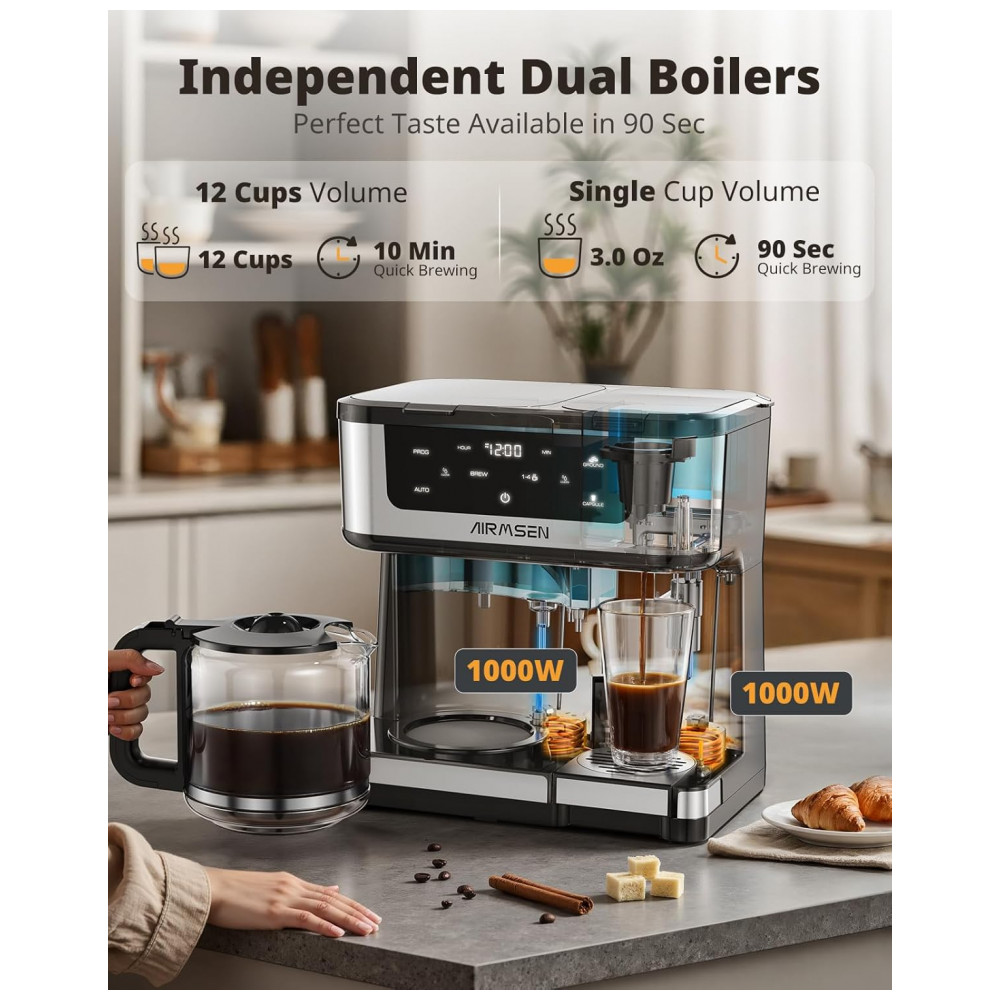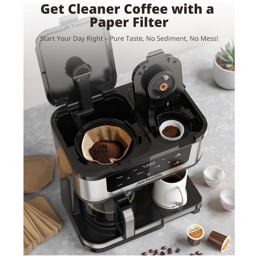Cafeteira Elétrica AIRMSEN Preta 18L 12 Xícaras Dupla Função Cápsulas e Pó Touchscreen 1000W 110V