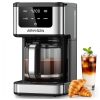 A jarra de vidro possui bico antigotas, reduzindo respingos durante o serviço. A bandeja de gotejamento removível permite ajuste de altura para diferentes tamanhos de xícaras e facilita a limpeza. O conjunto apresenta acabamento preto fosco com dimensões aproximadas de 25,4 cm de profundidade, 36,8 cm de largura e 36,8 cm de altura, adequado para uso em cozinhas residenciais e pequenos escritórios.